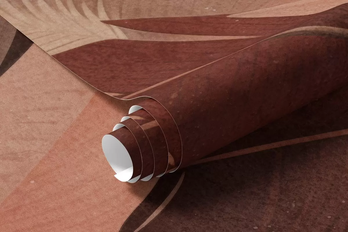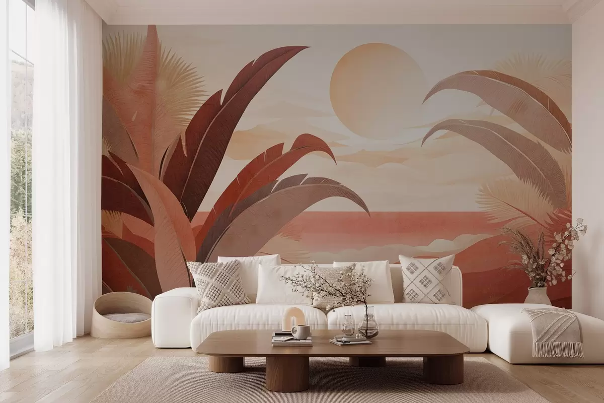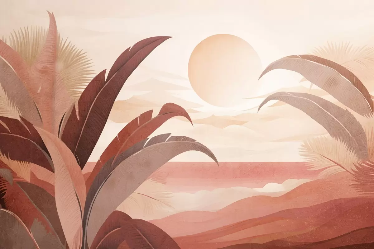 Wall murals Tropical textured abstract landscape with palm leaves and a big sun in the sky, warm color palette, minimalist style, stylized Nr. w09296