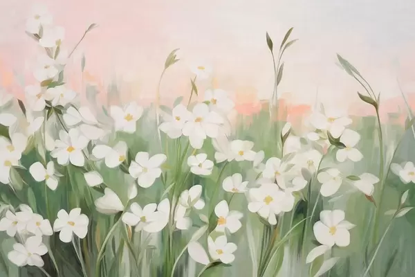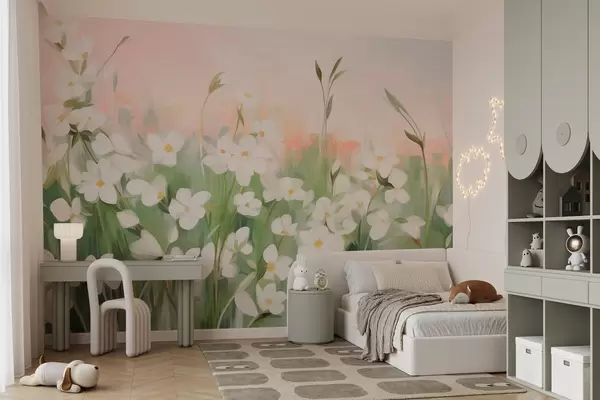 Wall murals Abstract field of wildflowers with green stems and leaves, against a soft pink and white textured sky Nr. w09297