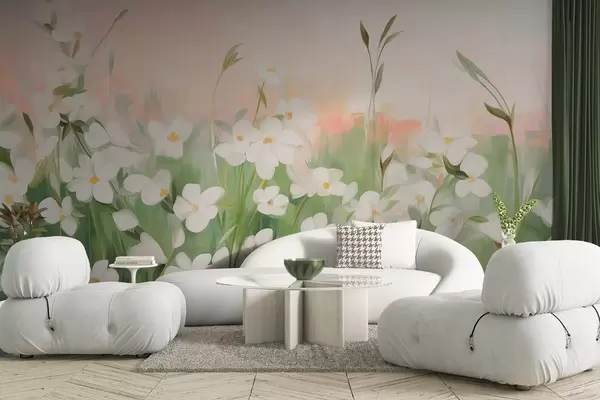 Wall murals Abstract field of wildflowers with green stems and leaves, against a soft pink and white textured sky Nr. w09297