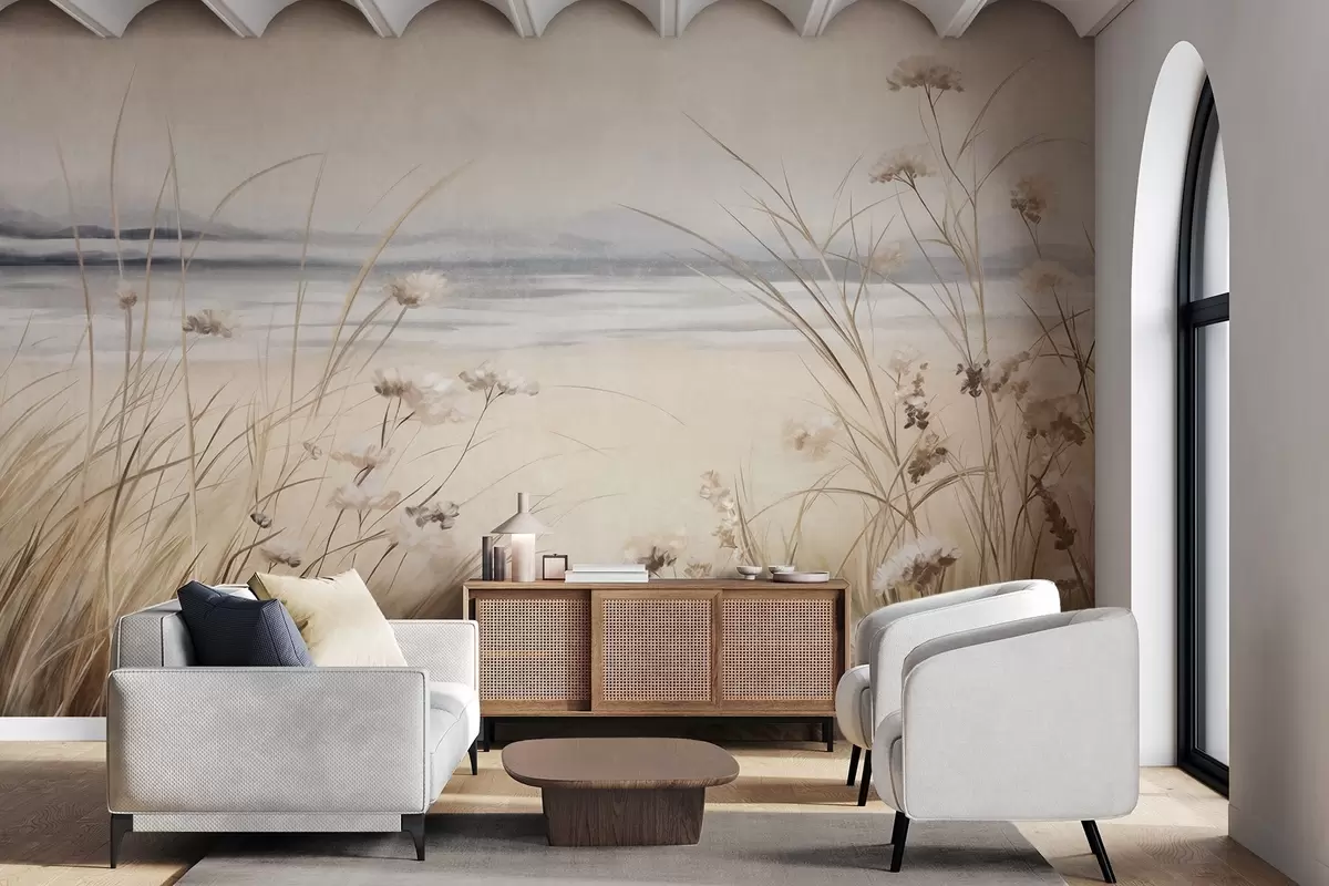 Wall murals A field of wheat with white flowers in the foreground, a beach and the ocean in the background, neutral pastel muted colors Nr. w09298