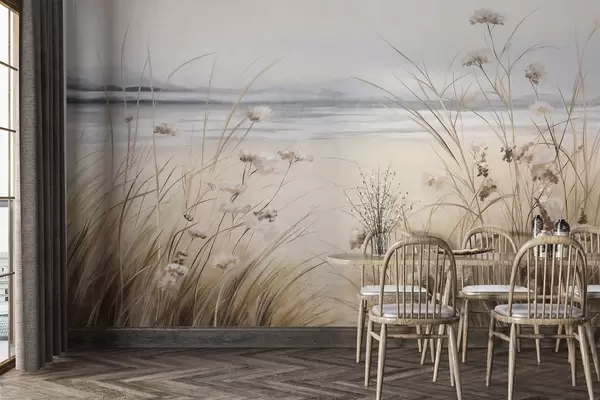 Wall murals A field of wheat with white flowers in the foreground, a beach and the ocean in the background, neutral pastel muted colors Nr. w09298