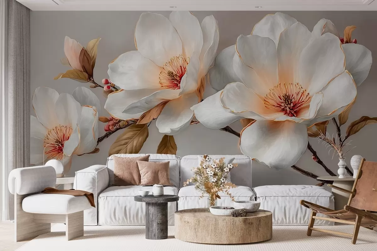 Wall murals Delicate flowers on a branch in pastel tones with orange centers Nr. w09299
