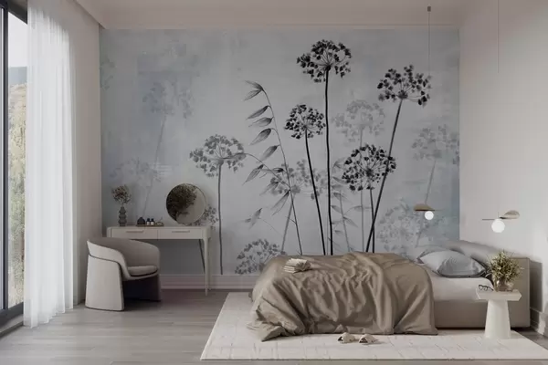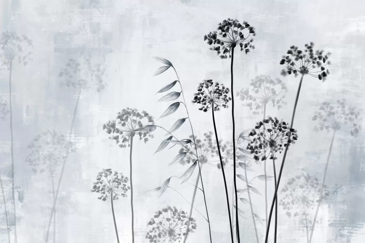 Wall murals Dried flowers drawing with long stems, monochrome palette, against a textured, light gray background, botanical illustration Nr. w09314