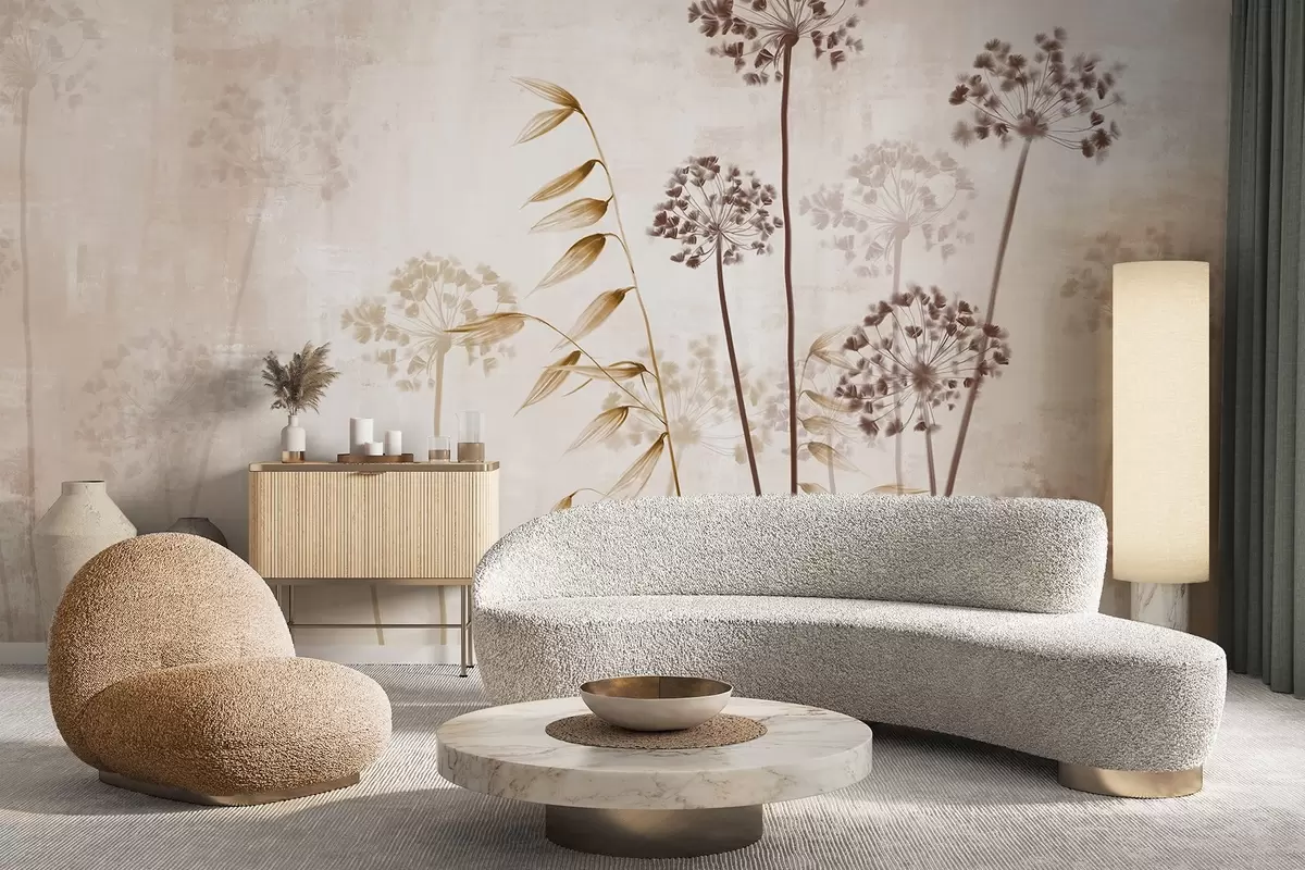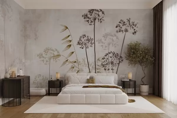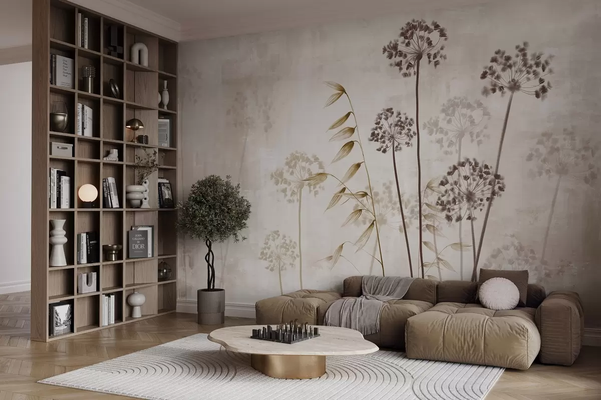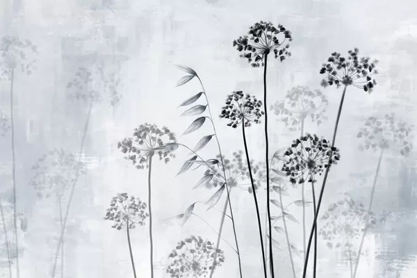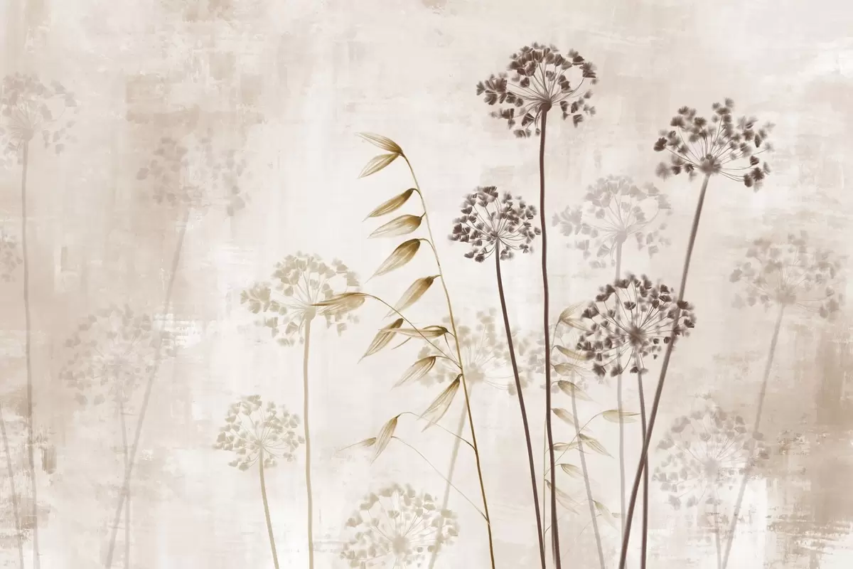 Wall murals Dried flowers drawing with long stems, monochrome palette, against a textured, light beige background, botanical illustration Nr. w09314v1