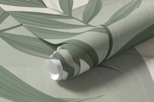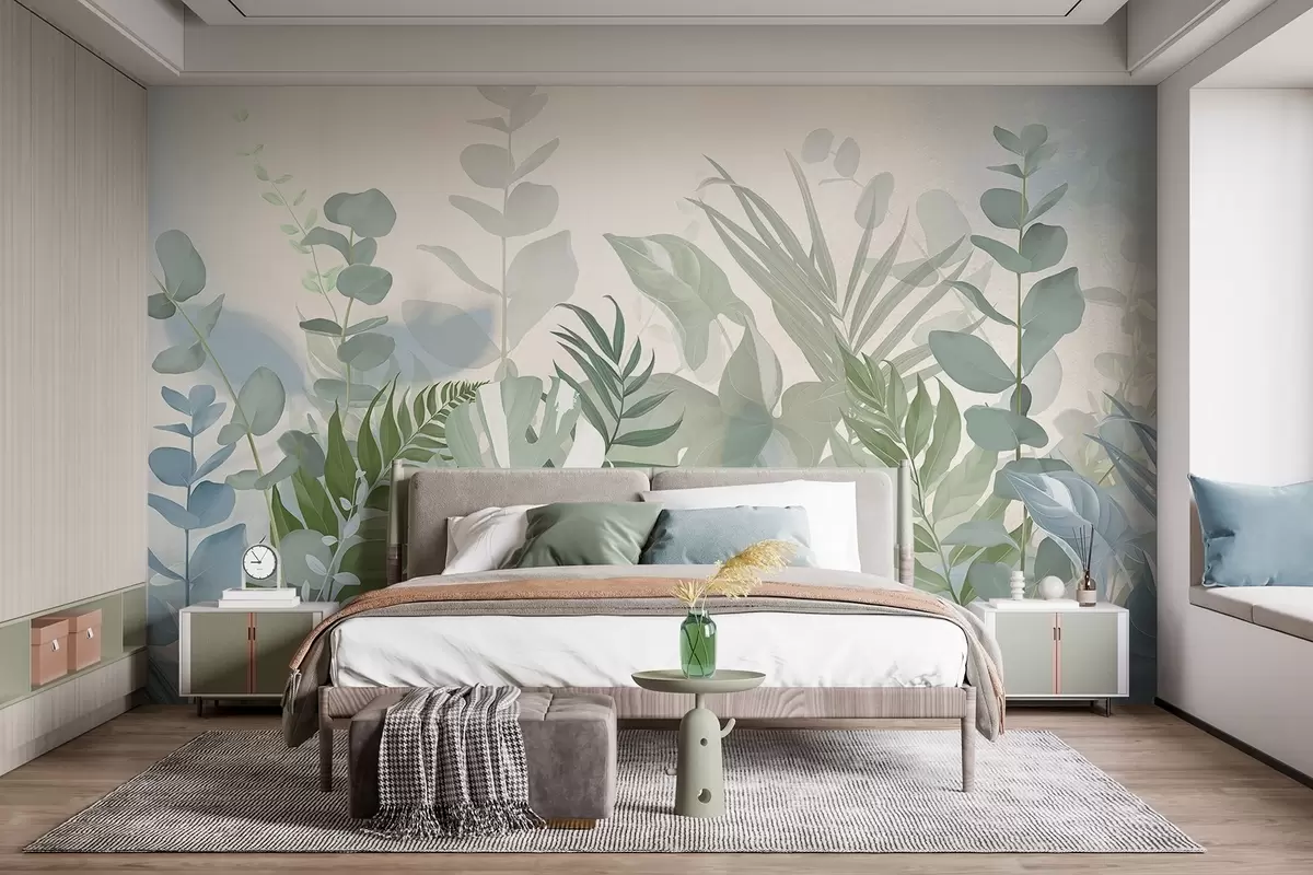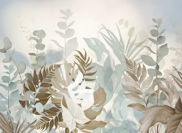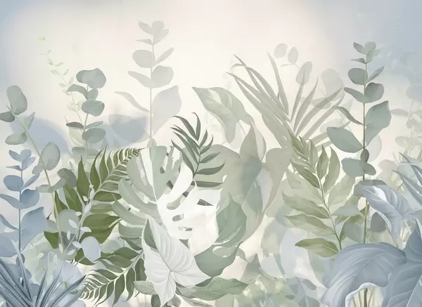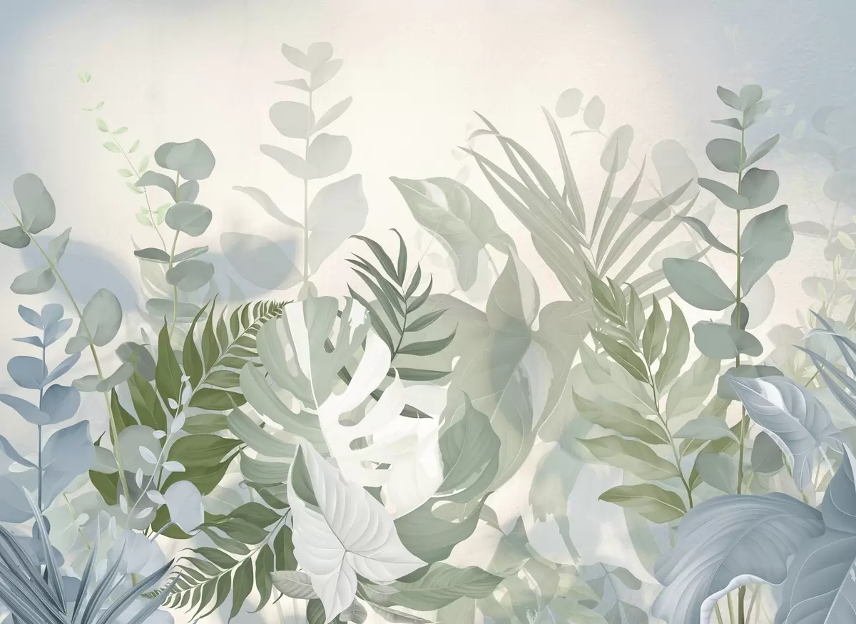 Wall murals Pastel green plants ferns, monstera and eucalyptus, light textured background, soft lighting, peaceful , botanical illustration Nr. w09316