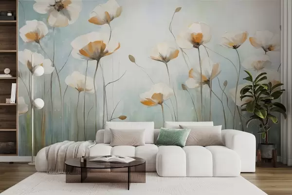 Wall murals White textured poppies on long stems, light blue and green background, soft brushstrokes, delicate floral field arrangement Nr. w09317