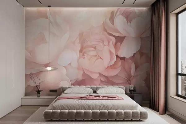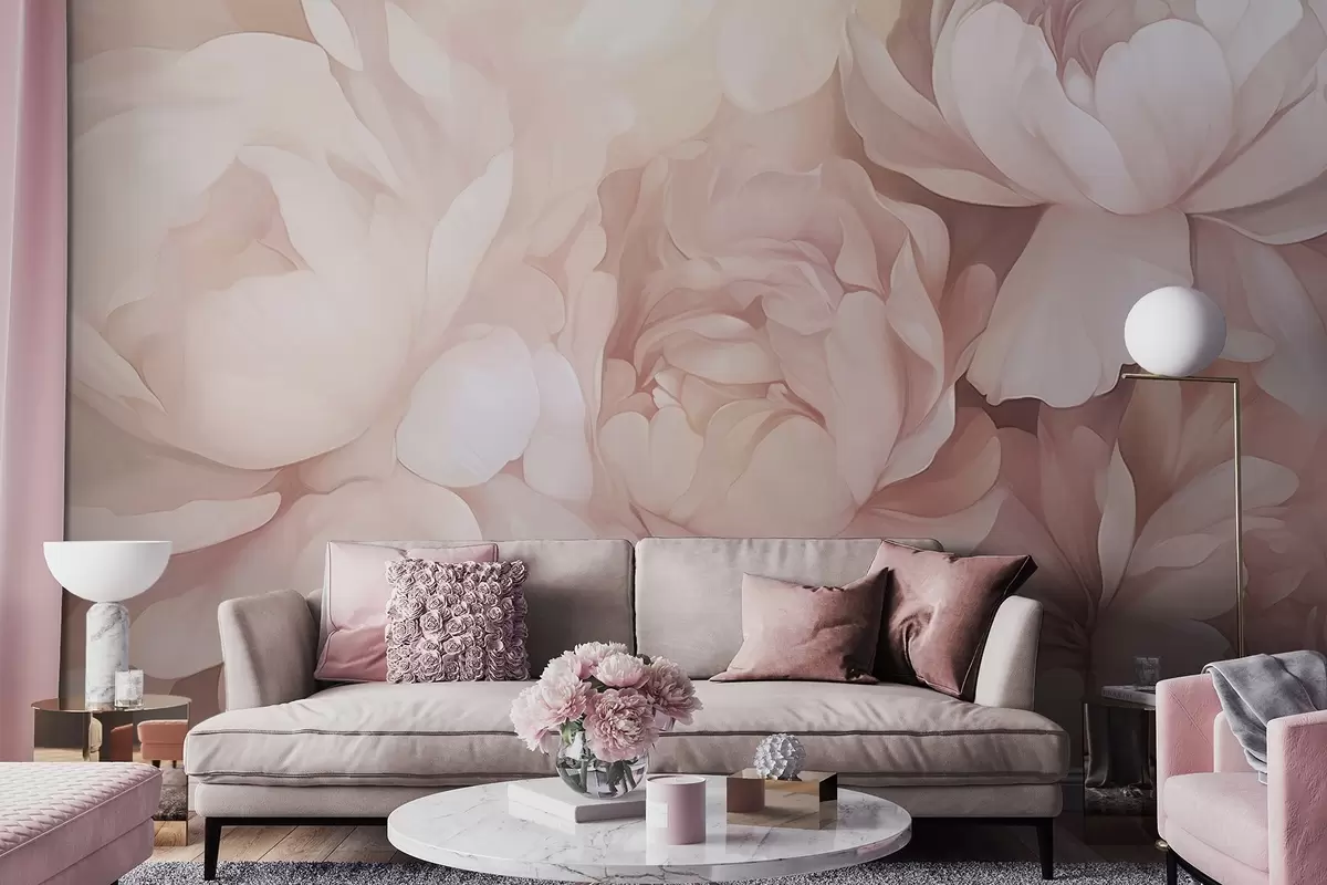 wall murals Light pastel pink peonies with soft, textured delicate petals, arranged closely together, creating a dense floral art, soft lighting w09319