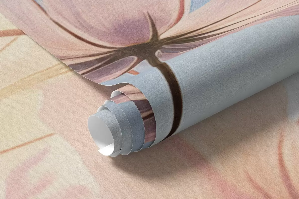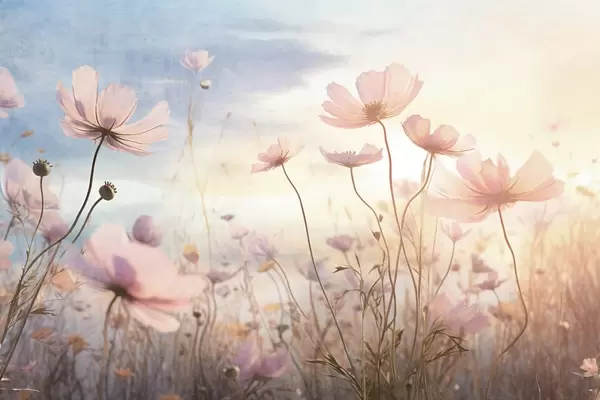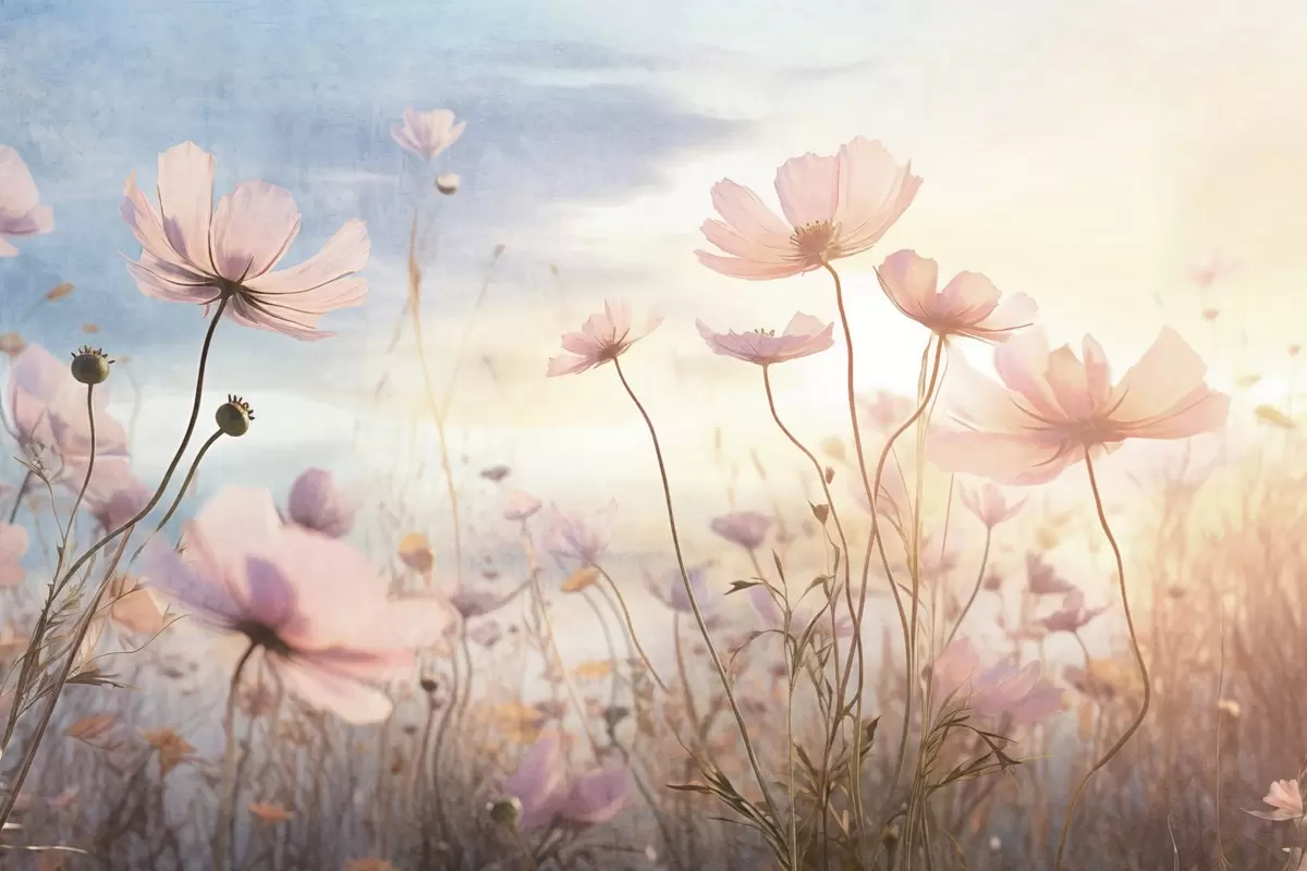 Wall murals A field of pink textured flowers with long stems, against a soft blue and yellow sky, creating a dreamy atmosphere Nr. w09320