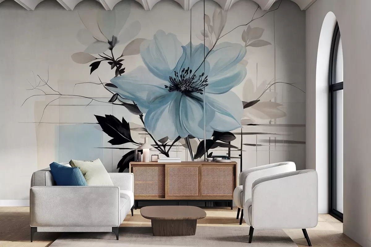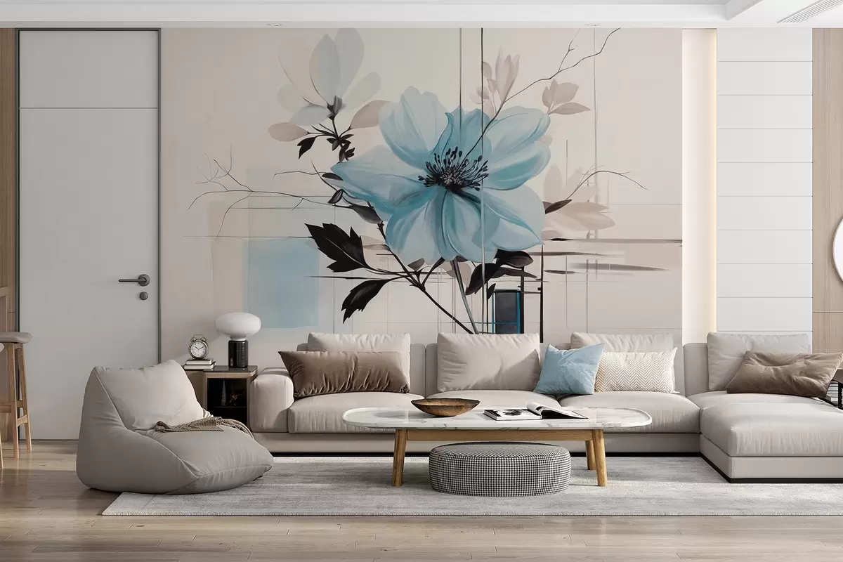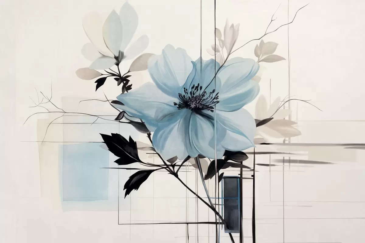 Wall murals Abstract textured blue flower with dark leaves and branches, geometric minimalistic shapes and lines in muted colors Nr. w09332