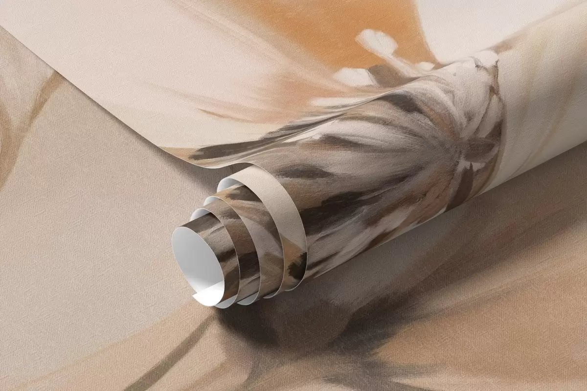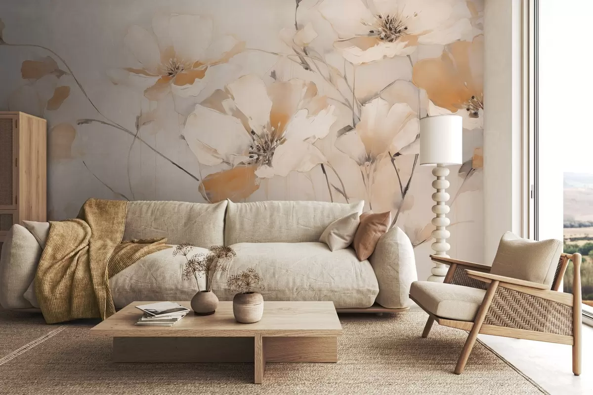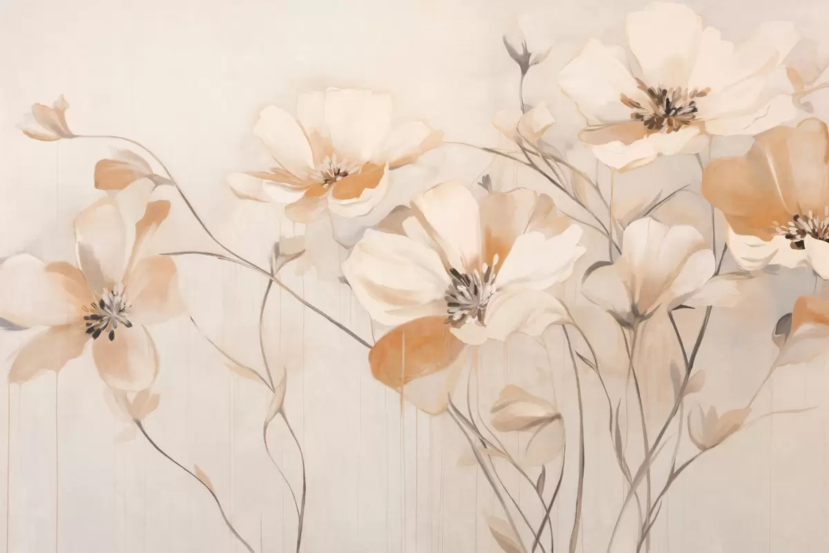 Wall murals White and orange textured flowers with long stems, light background, soft colors, elegant composition, delicate brushstrokes Nr. w09335