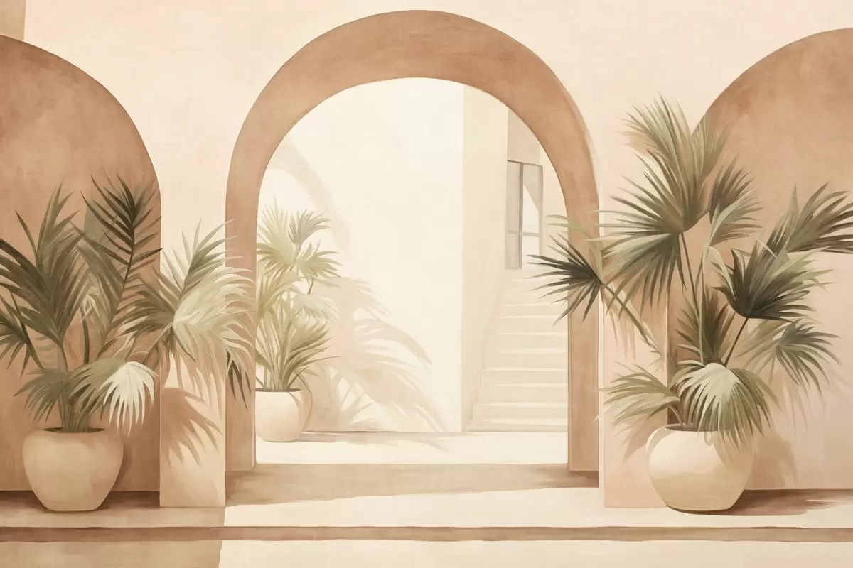 Wall murals Textured arches with potted plants, light beige color palette, minimalist design, staircase in the background Nr. w09339