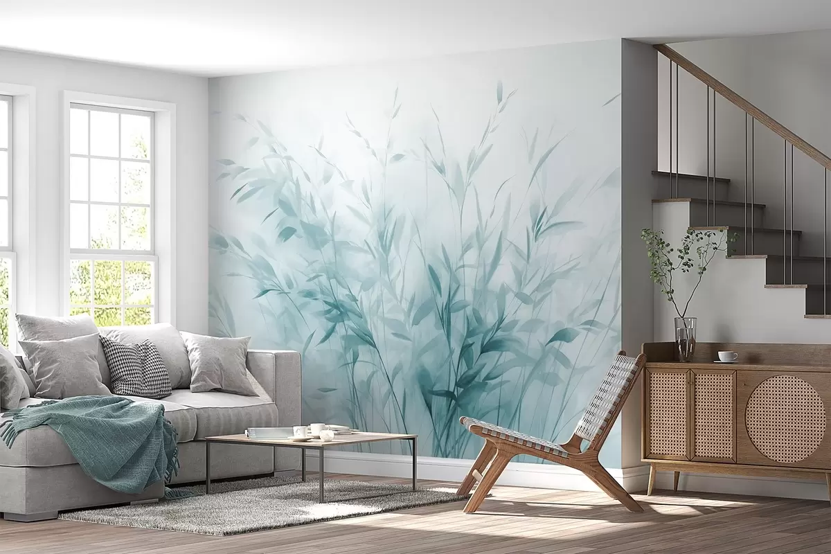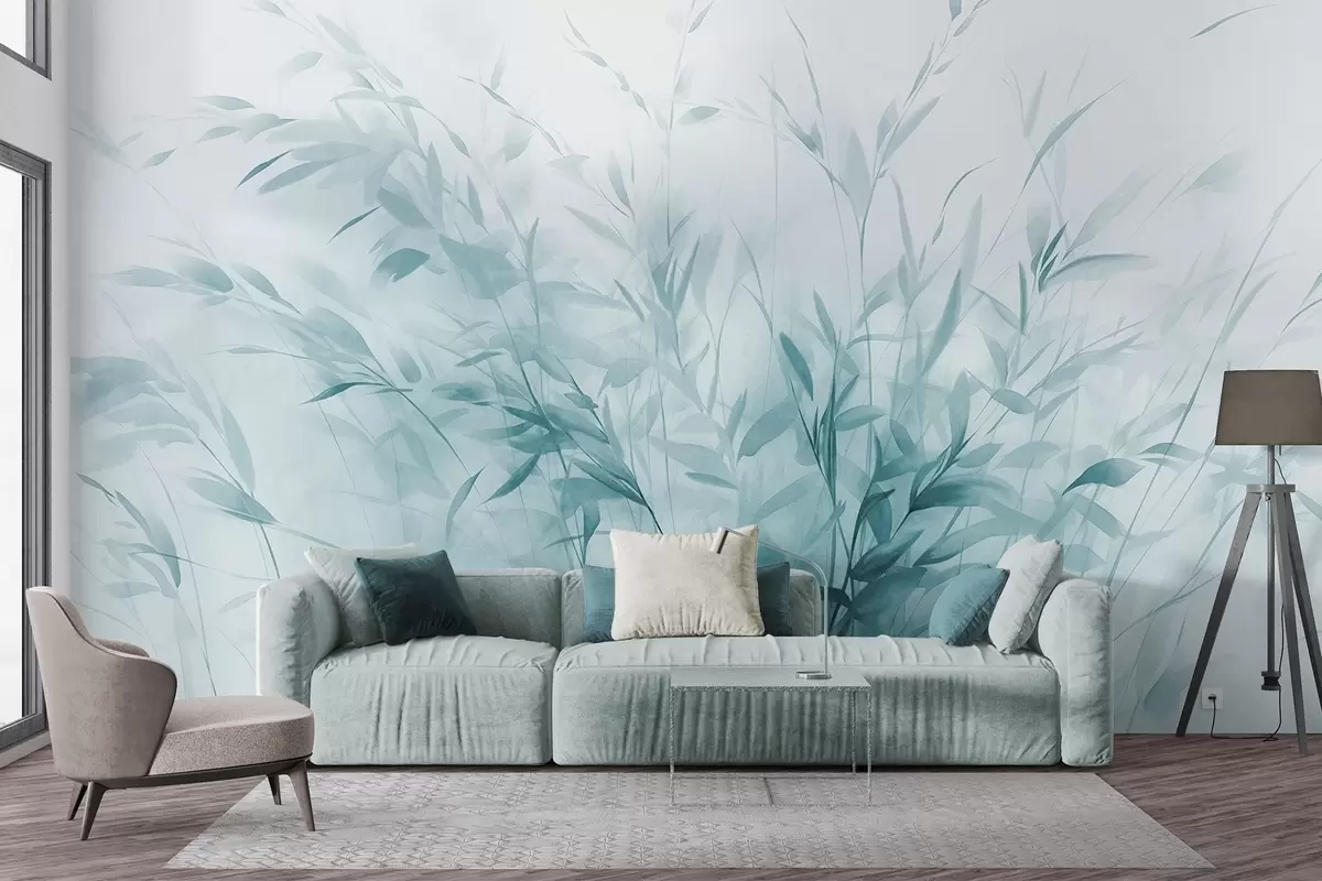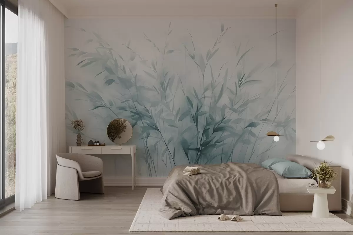 Wall murals Grass and weeds with thin leaves and stems, light blue colors, soft and delicate brushstrokes, minimalist print Nr. w09342v1