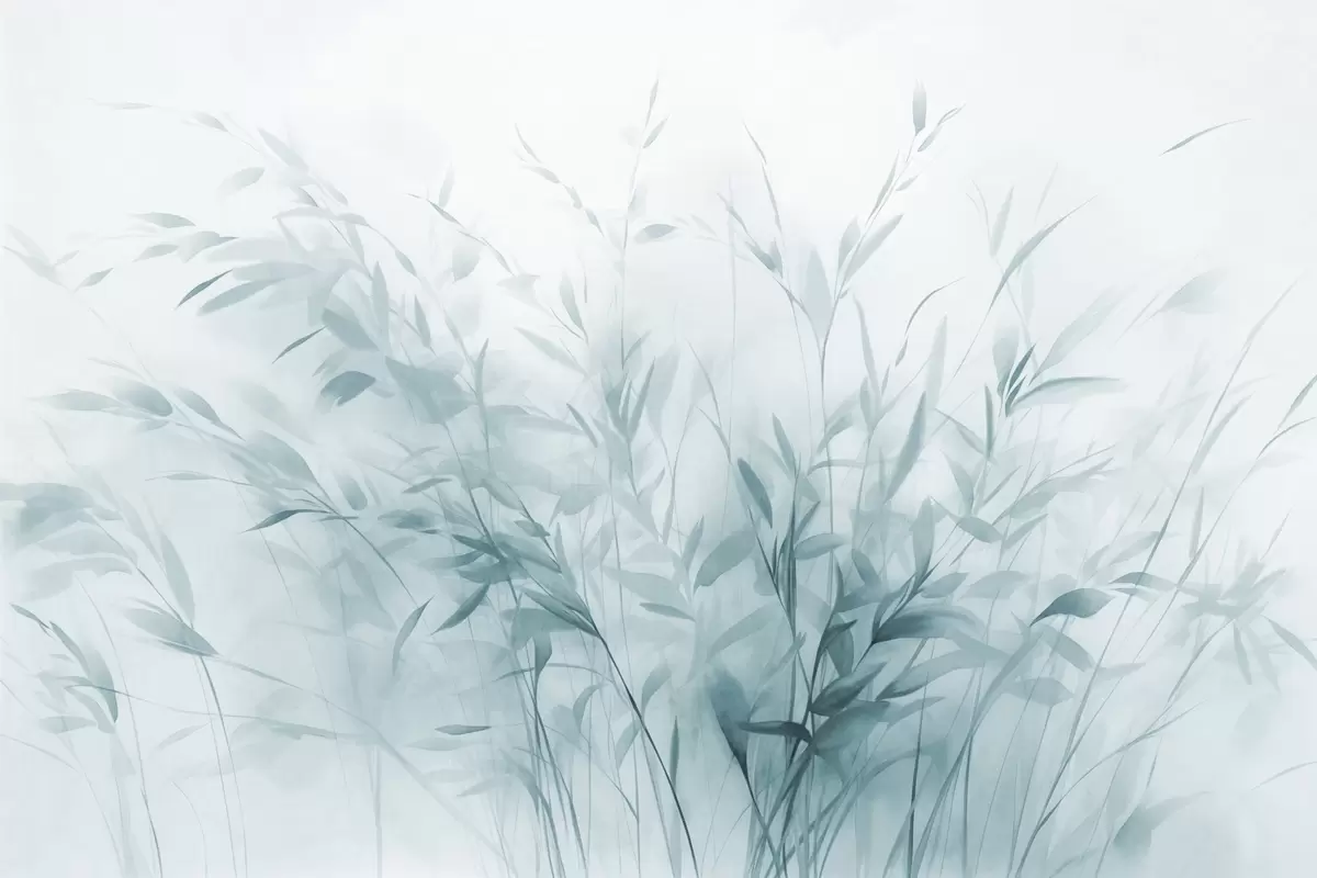 Wall murals Grass and weeds with thin leaves and stems, light blue colors, soft and delicate brushstrokes, minimalist print Nr. w09342v1
