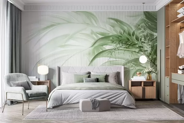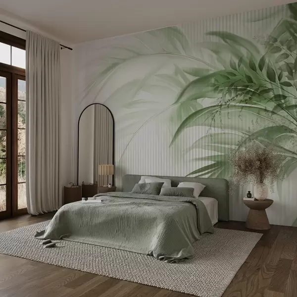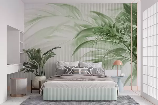 Wall murals Palm tropical green leaves with a white striped background, soft lighting, delicate brushstrokes, organic forms Nr. w09343
