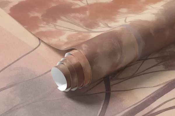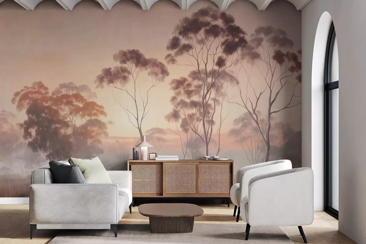 Wall murals A landscape with eucalyptus trees in a field with pastel pink and orange sky, a light mist, painting textured style Nr. w09367