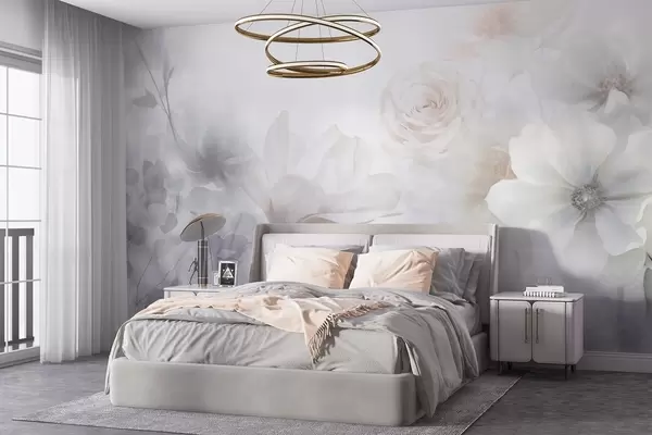 wall murals A delicate abstract floral arrangement with pastel pink roses and magnolias, soft focus, light gray background w09371
