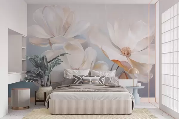 Wall murals White fantasy magnolia flowers with delicate textured petals, a soft, abstract background Nr. w09373