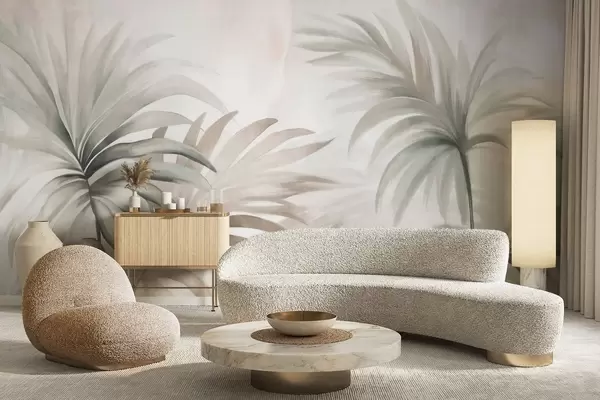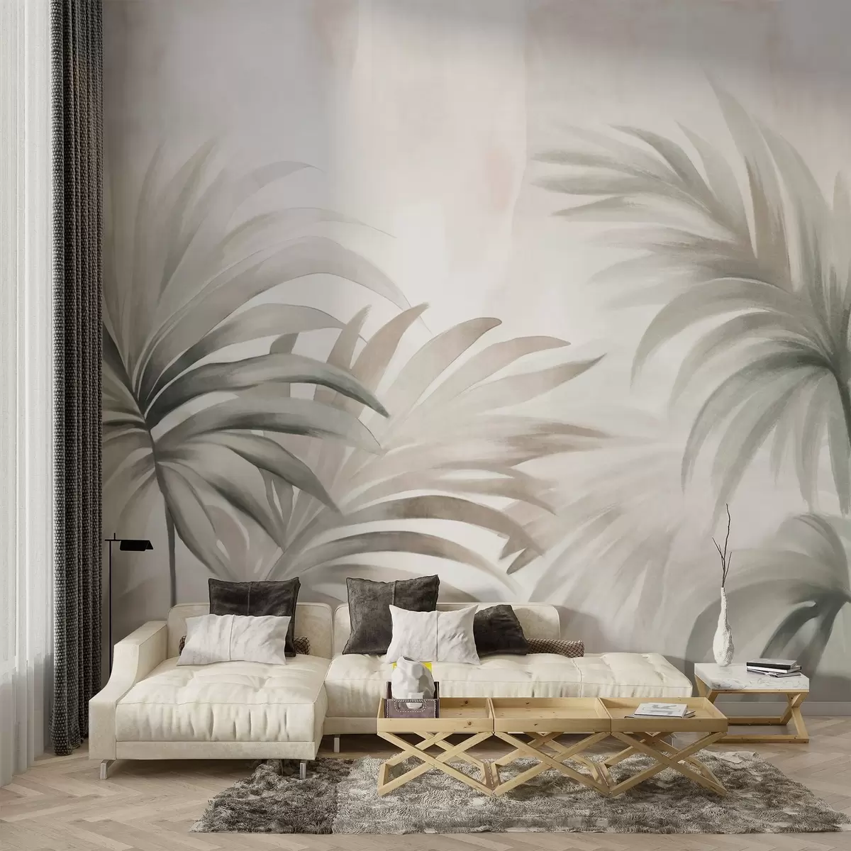 Wall murals Palm tree textured leaves in neutral colors, beige abstract background, soft brush strokes, tropical textured foliage Nr. w09380
