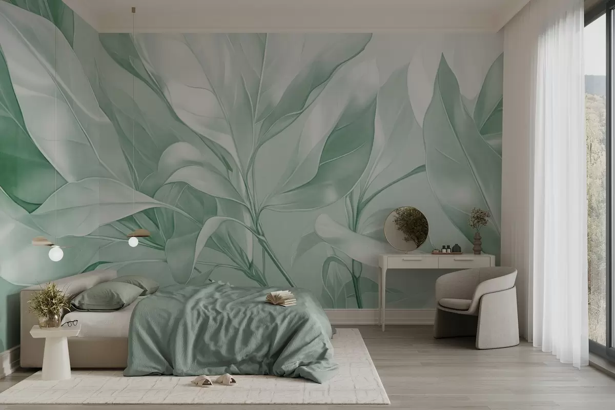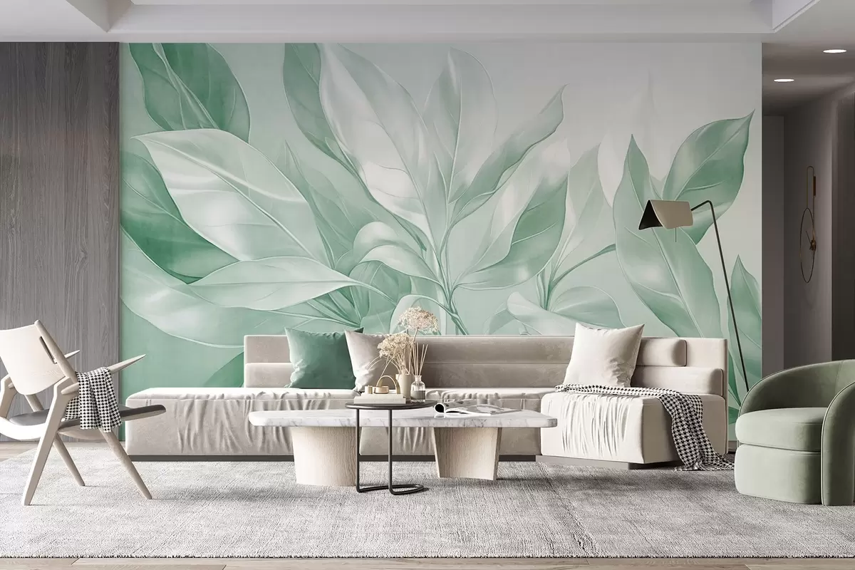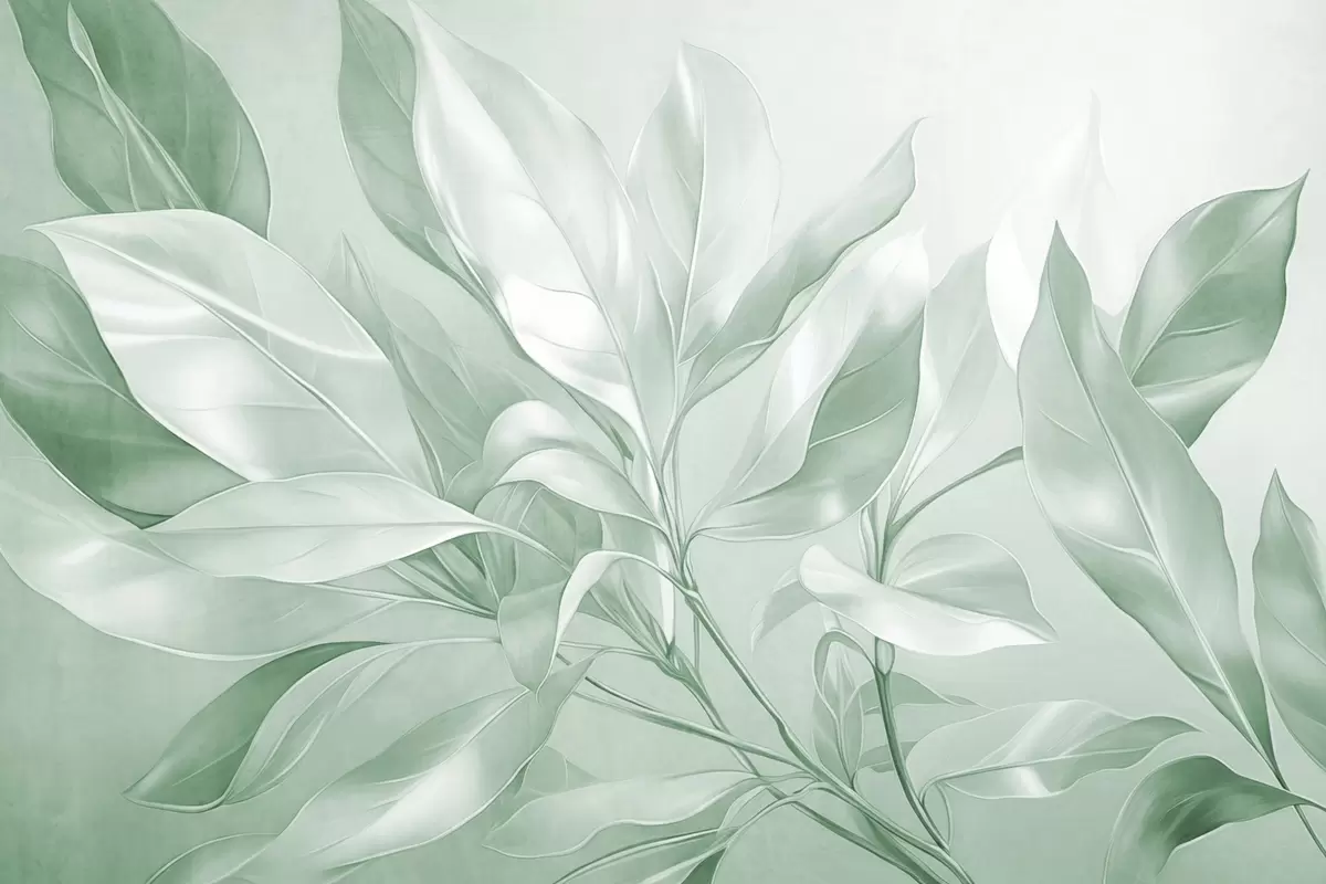 Wall murals Magnolia leaves with white and green tones, soft lighting, elegant composition, detailed leaf veins, artistic brushstrokes Nr. w09385v1