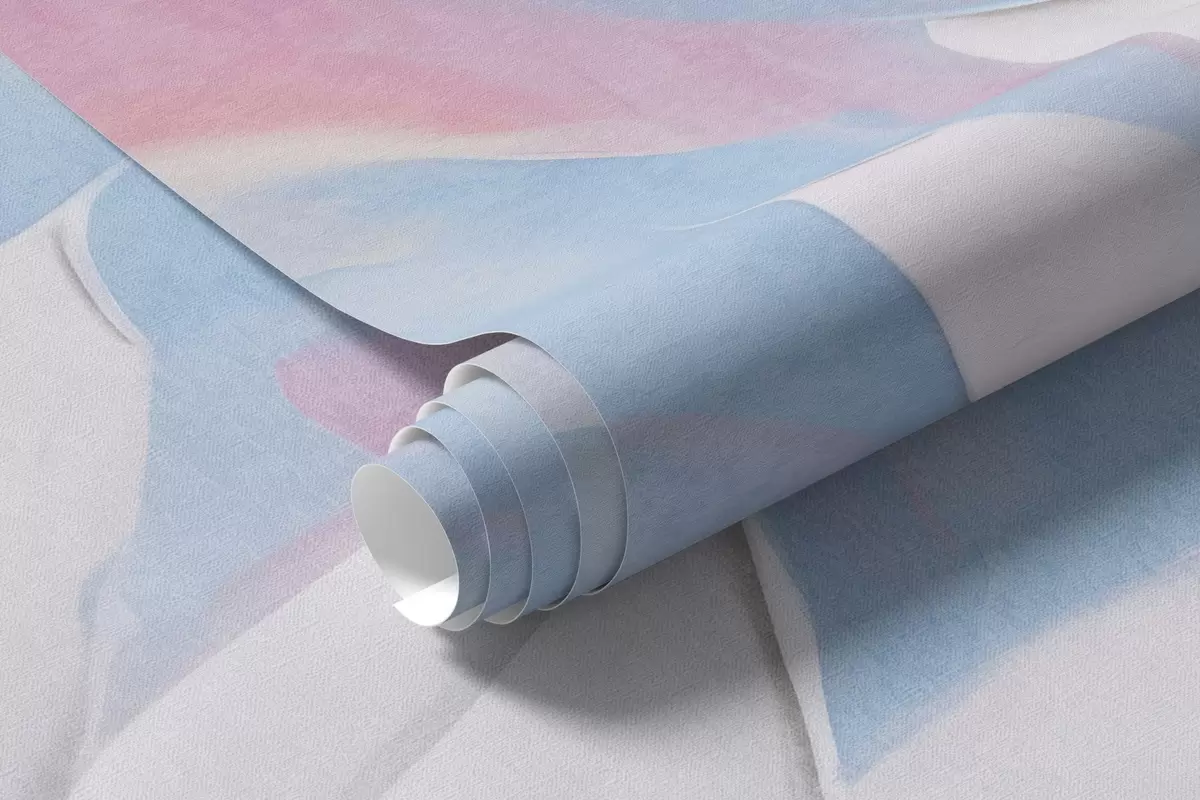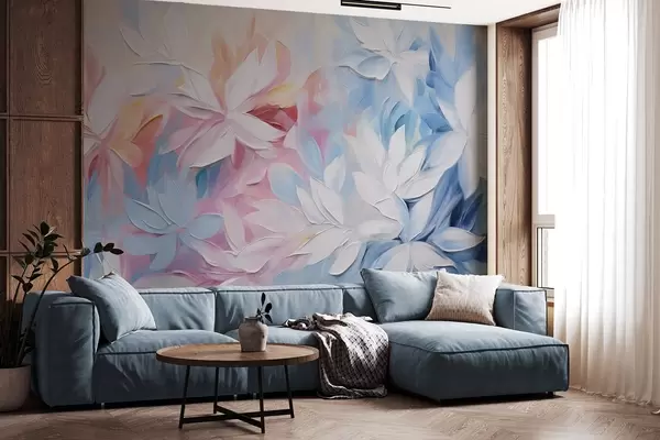 Wall murals White textured flowers with pink and blue leaves, oil painting abstract style, soft brush strokes, pastel colors Nr. w09396