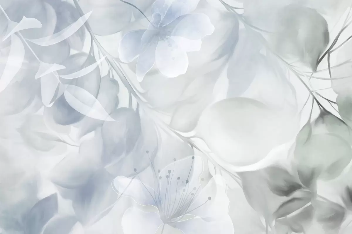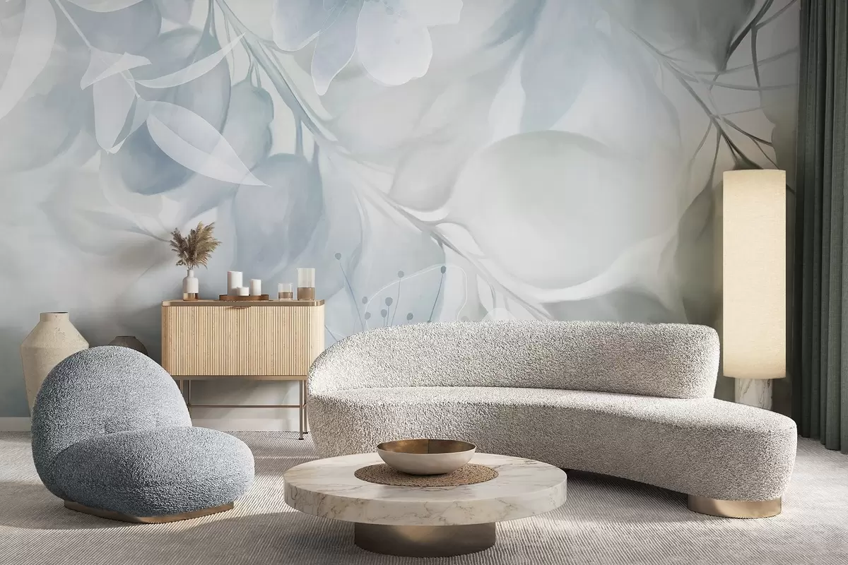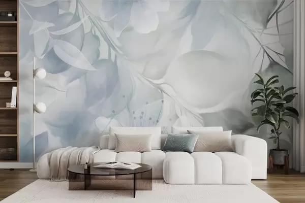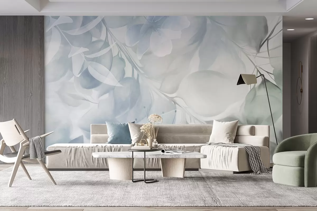Wall murals Floral art with muted blue and green flowers, leaves and branches, soft pastel colors, watercolor textured effect Nr. w09397v1