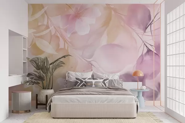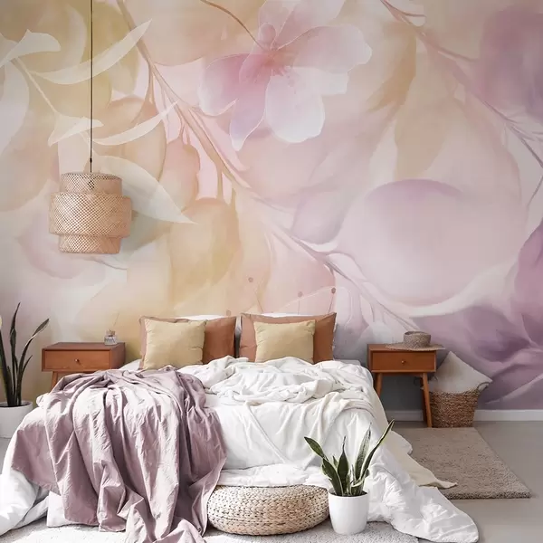 Wall murals Floral art with muted yellow and purple flowers, leaves and branches, soft pastel colors, watercolor textured effect Nr. w09397v2