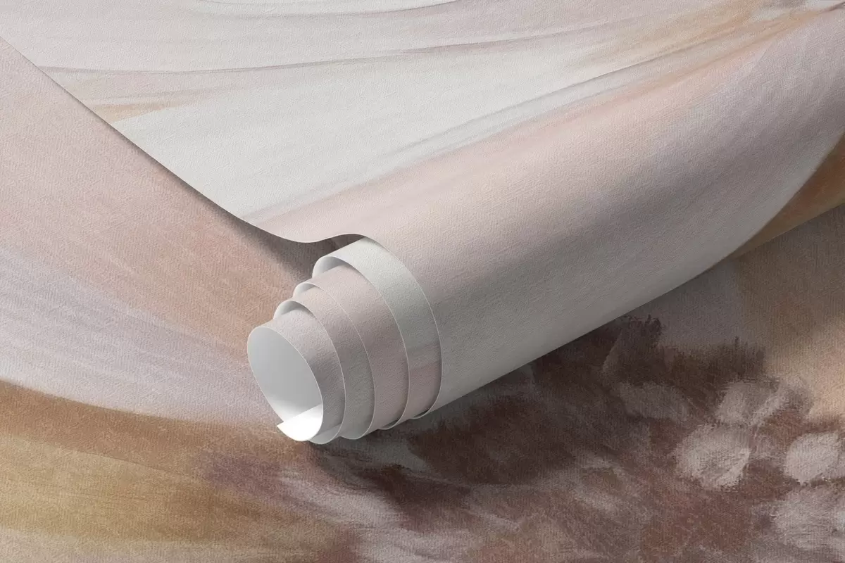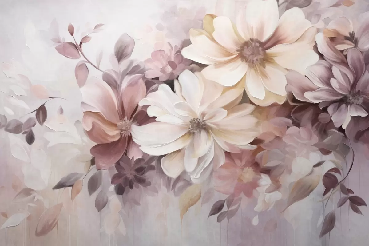 Wall murals A floral arrangement with large textured soft-colored flowers in shades of burgundy, peach, and white, with delicate leaves Nr. w09398