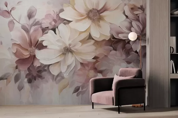 Wall murals A floral arrangement with large textured soft-colored flowers in shades of burgundy, peach, and white, with delicate leaves Nr. w09398