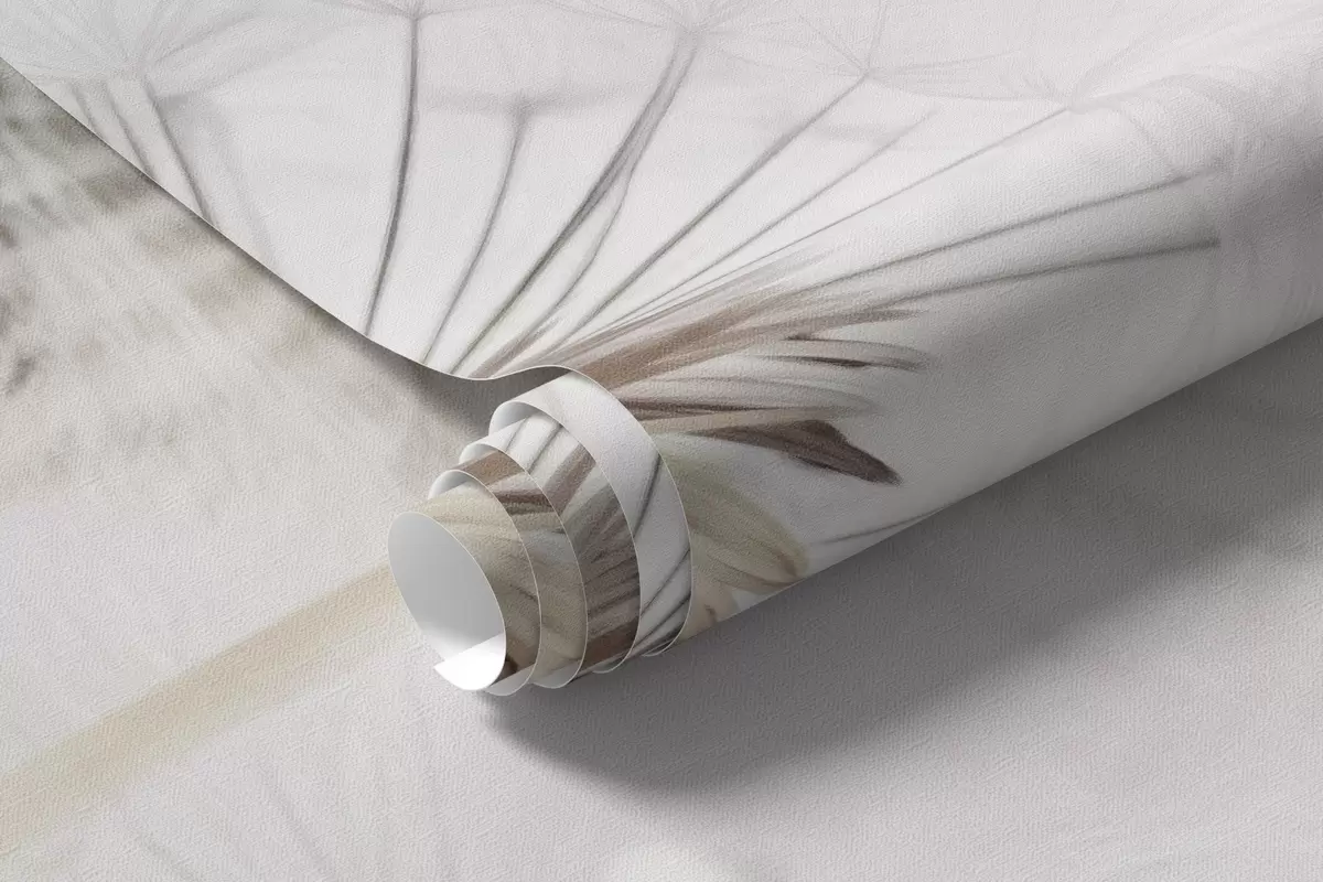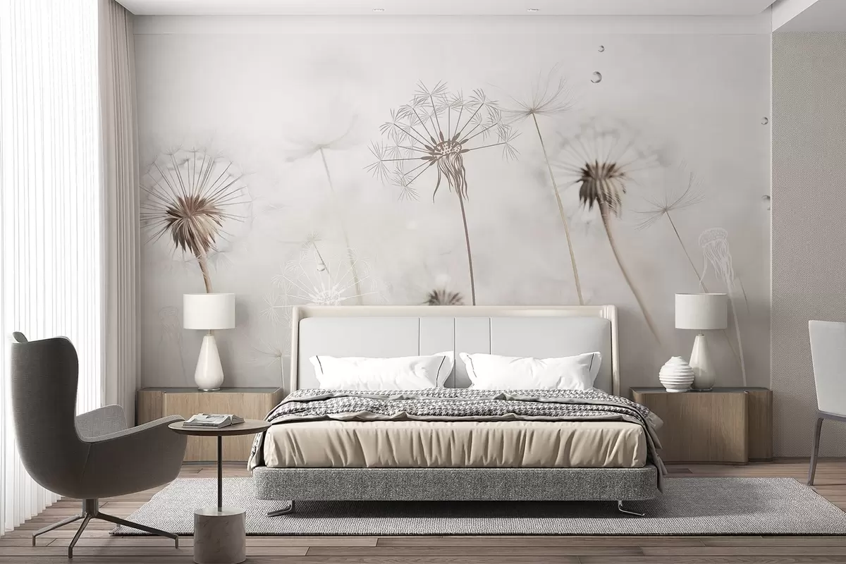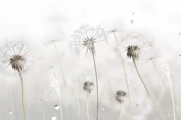 Wall murals Dandelions with water drops, white background, close up, soft light, nature, botanical, ethereal, delicate, minimalist Nr. w09399