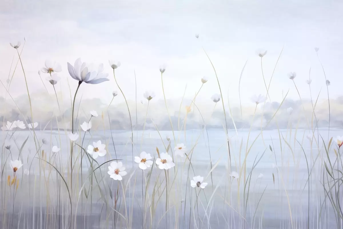 Wall murals White flowers with long stems in a field, light blue sky, soft colors, textured, minimalist style, nature-inspired, calm background Nr. w09401
