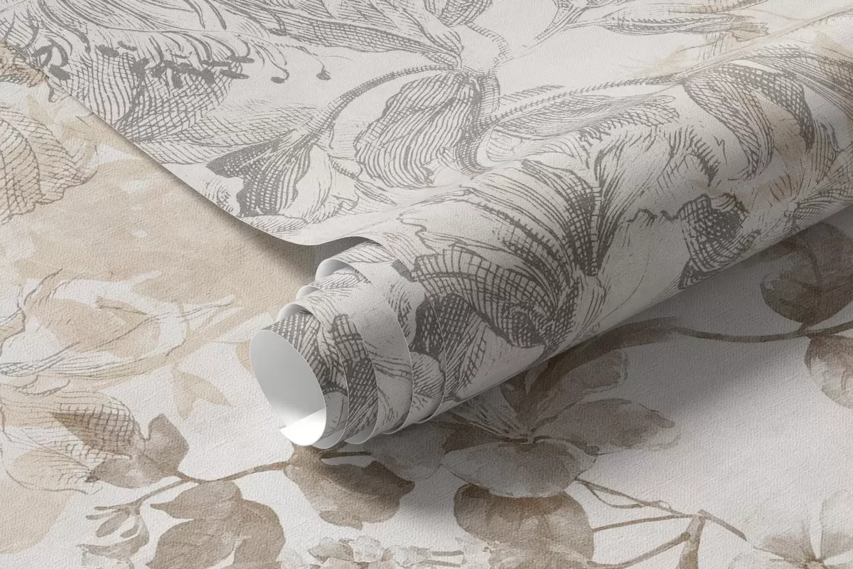 Wall murals Vintage textured floral art with drawing style delicate garden flowers and leaves illustrations, soft pastel beige and sepia tones Nr. w09402