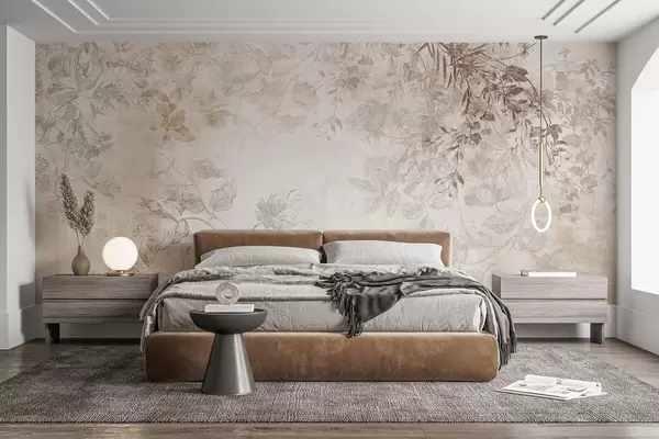 Wall murals Vintage textured floral art with drawing style delicate garden flowers and leaves illustrations, soft pastel beige and sepia tones Nr. w09402