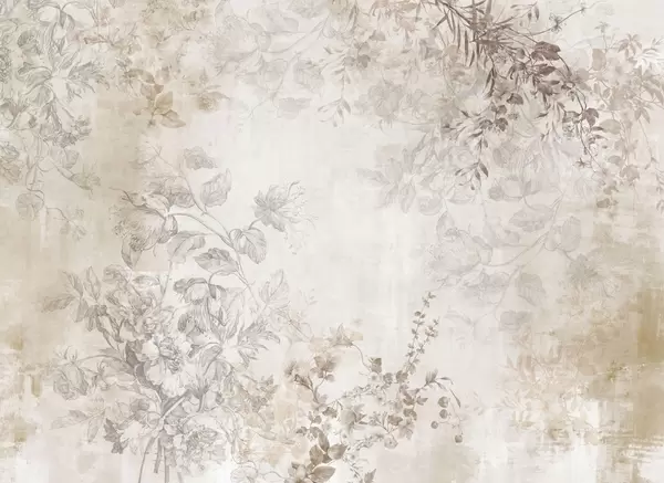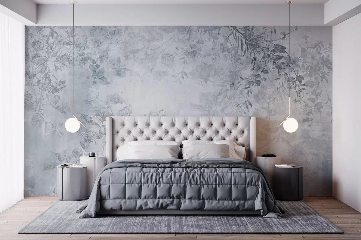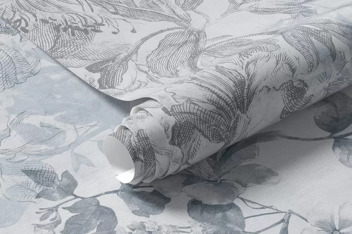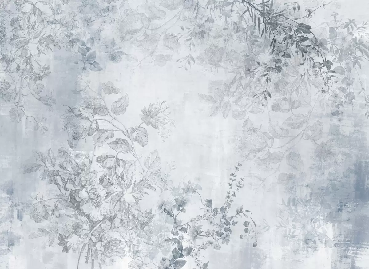 Wall murals Vintage textured floral art with drawing style delicate garden flowers and leaves illustrations, soft blue tones Nr. w09402v1