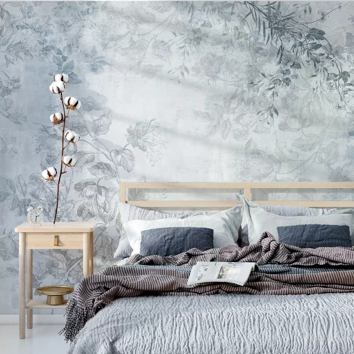 wall murals Vintage textured floral art with drawing style delicate garden flowers and leaves illustrations, soft blue tones w09402v1