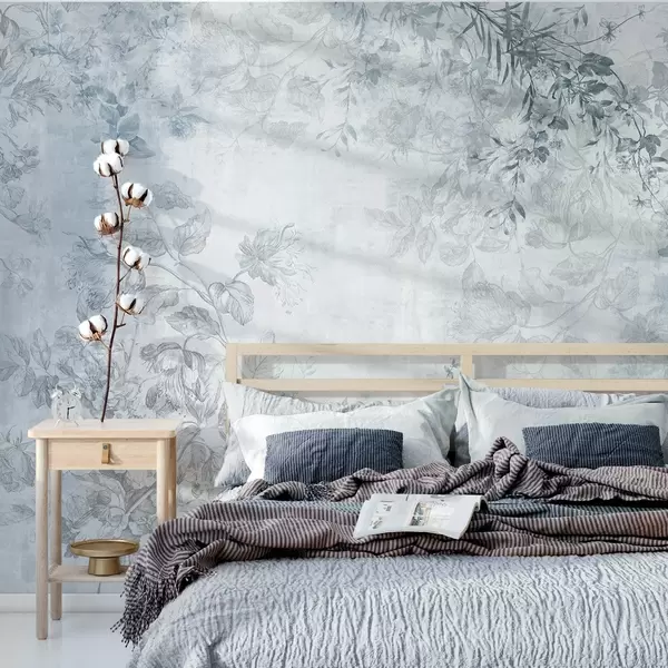 Wall murals Vintage textured floral art with drawing style delicate garden flowers and leaves illustrations, soft blue tones Nr. w09402v1