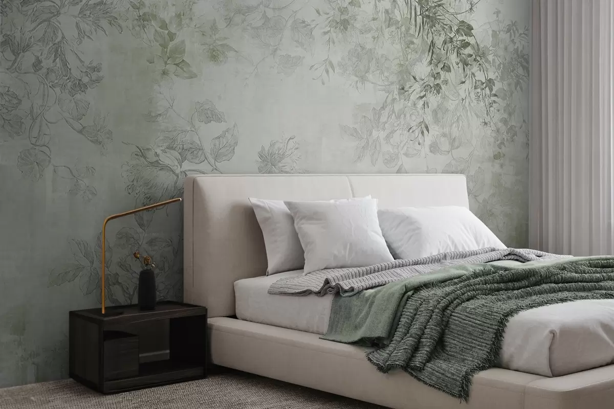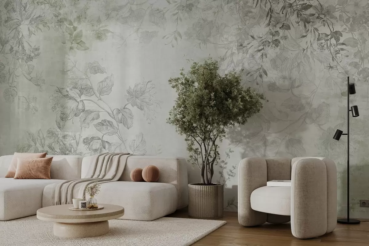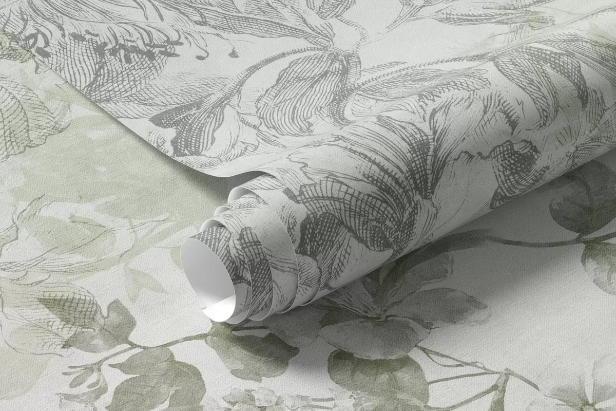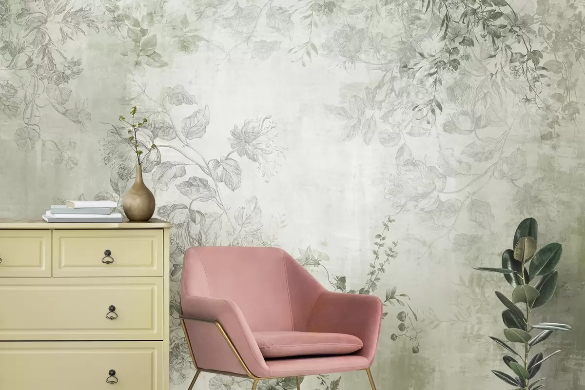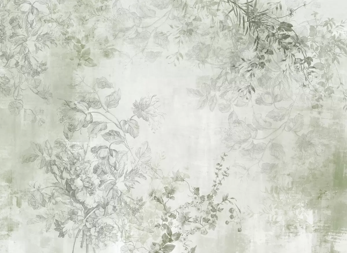 Wall murals Vintage textured floral art with drawing style delicate garden flowers and leaves illustrations, soft green tones Nr. w09402v2