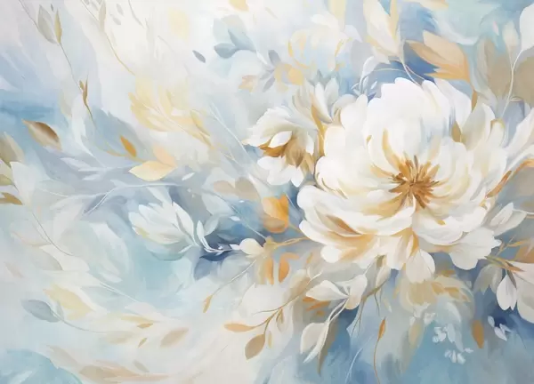 Wall murals Textured white flower with blue and yellow details and leaves on a blue and white abstract background, painting style Nr. w09403
