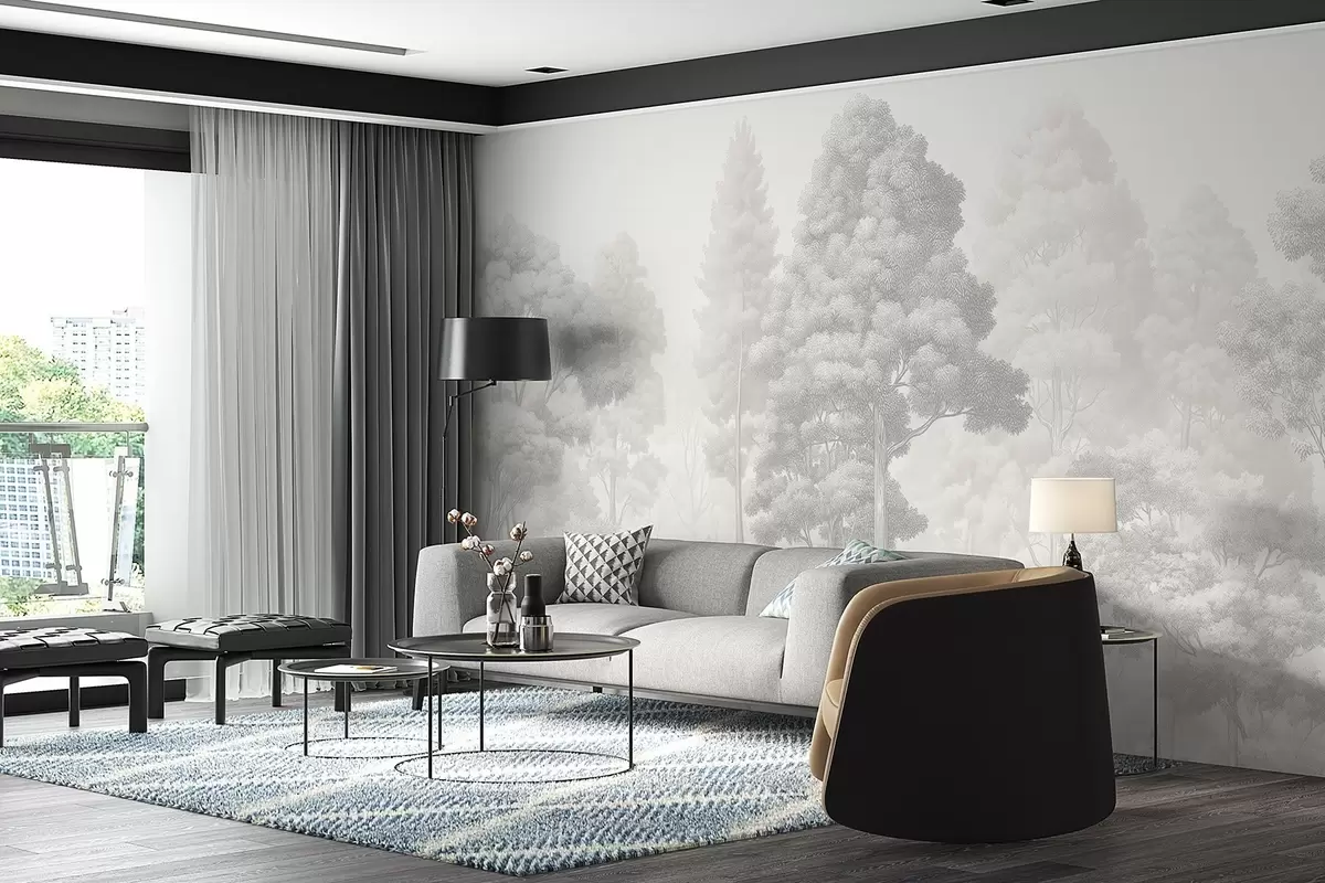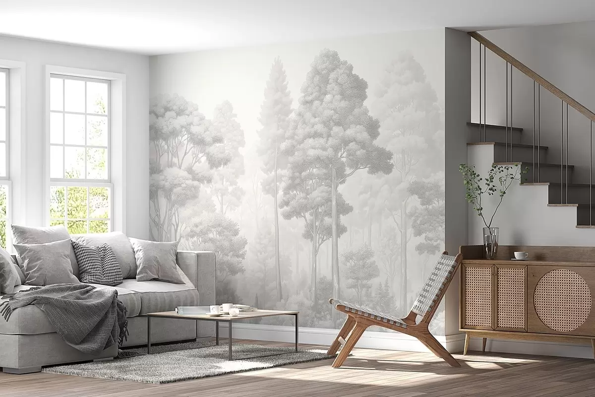 Wall murals Artistic forest landscape in the technique of black-and-white graphic hatching Nr. w09411