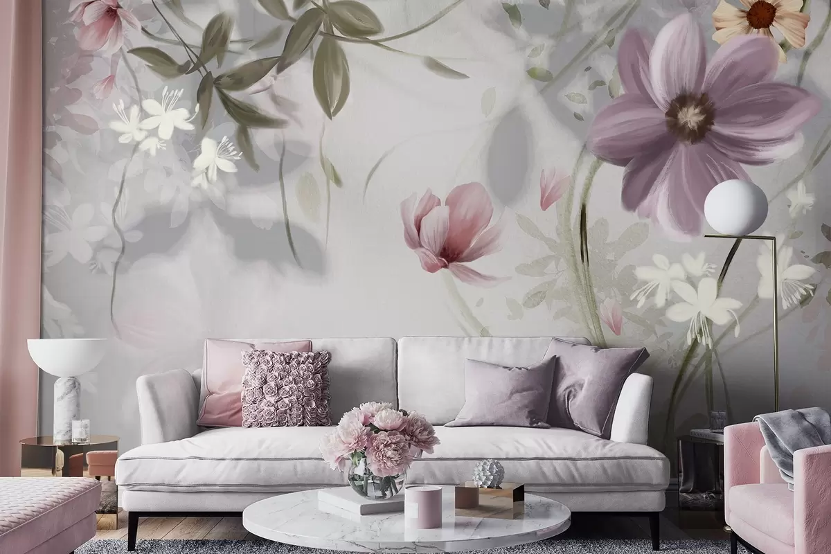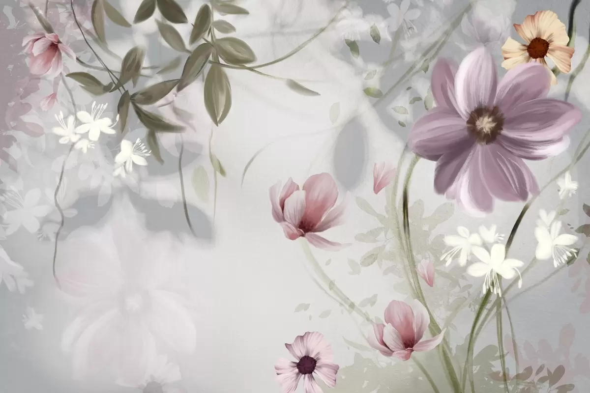 Wall murals Pink and white flowers with green stems and leaves, soft lighting, muted colors, floral arrangement Nr. w09417v1