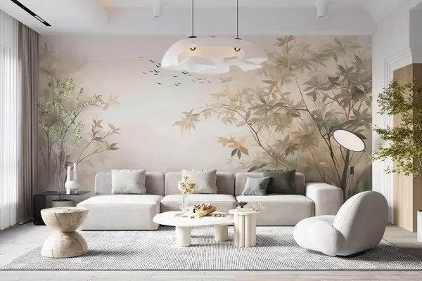 Wall murals Textured landscape with trees and a flock of birds flying in the sky, pastel colors, nature scene Nr. w09418