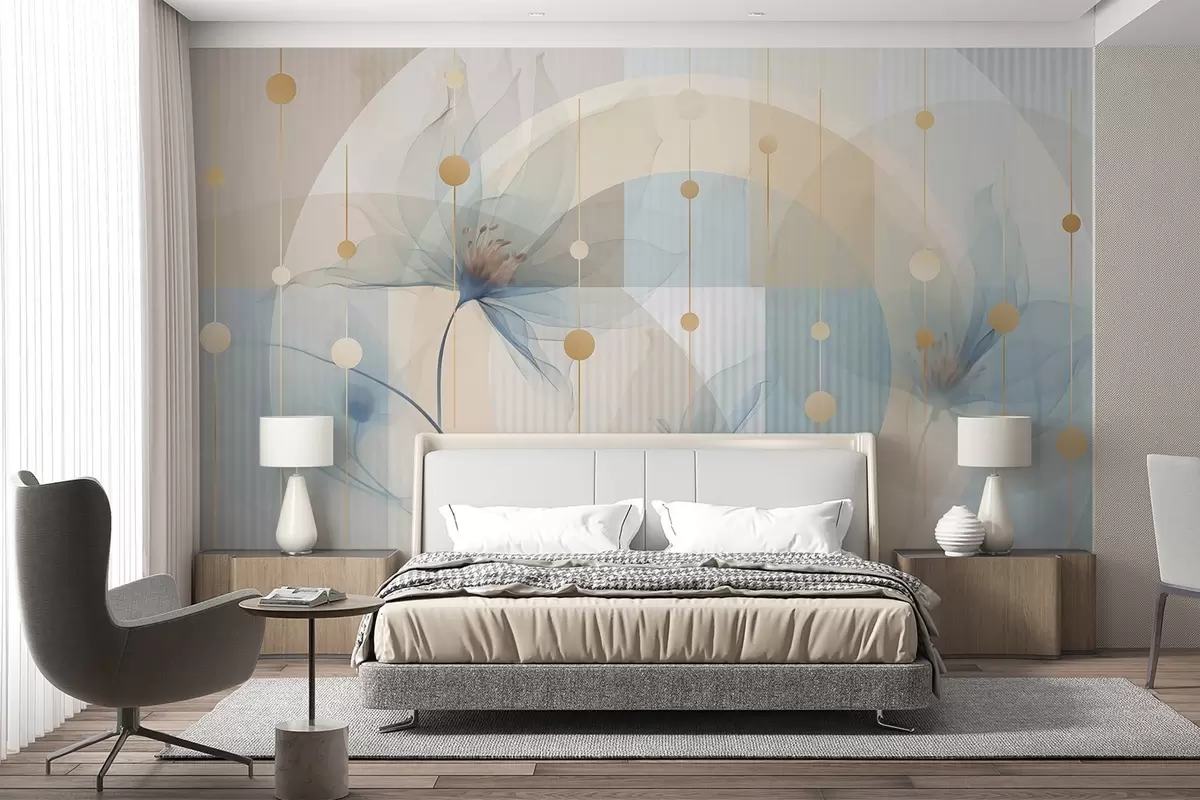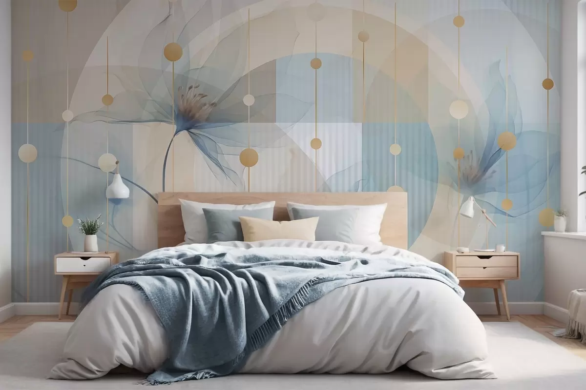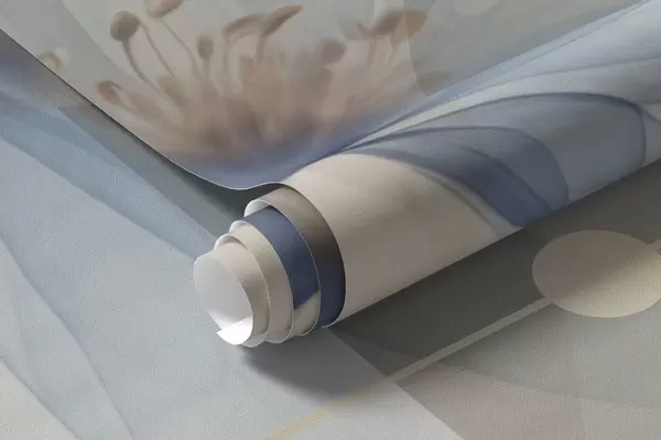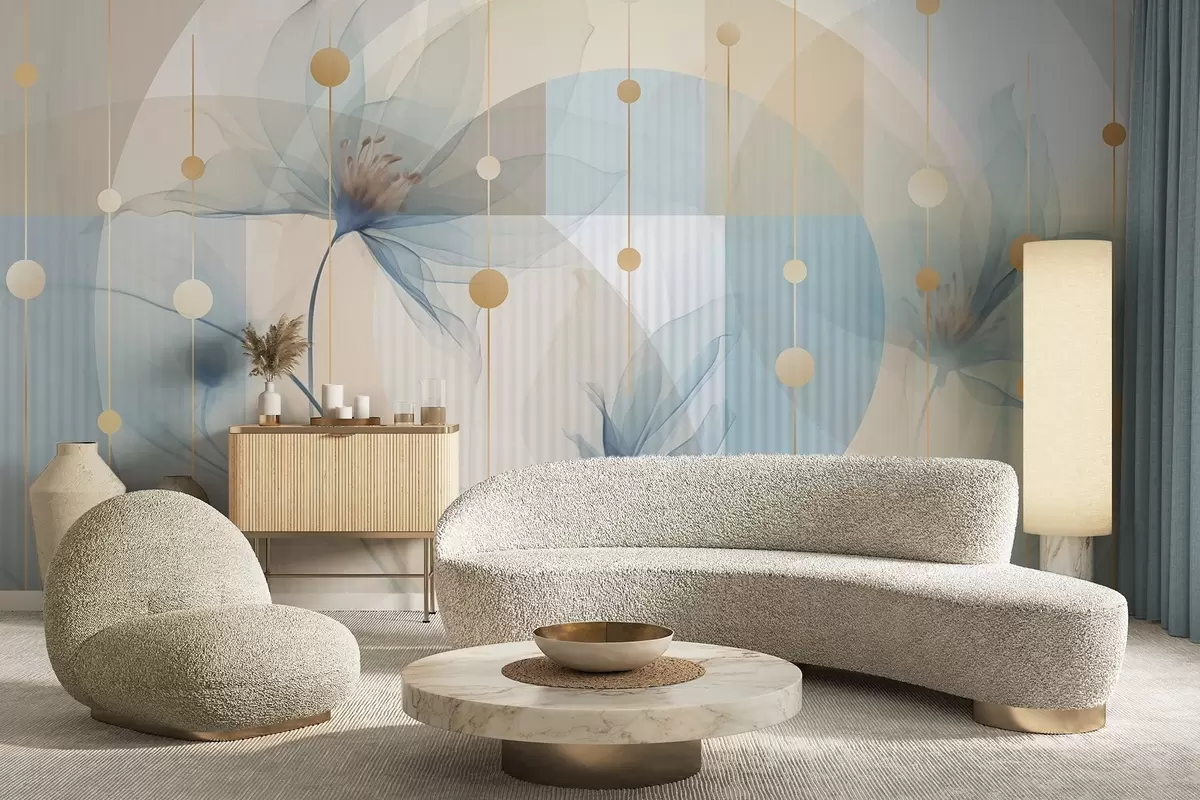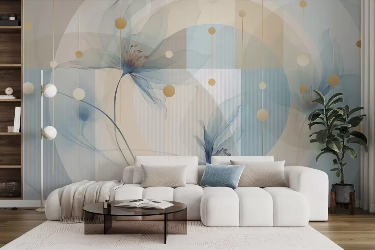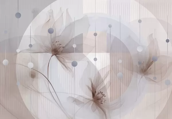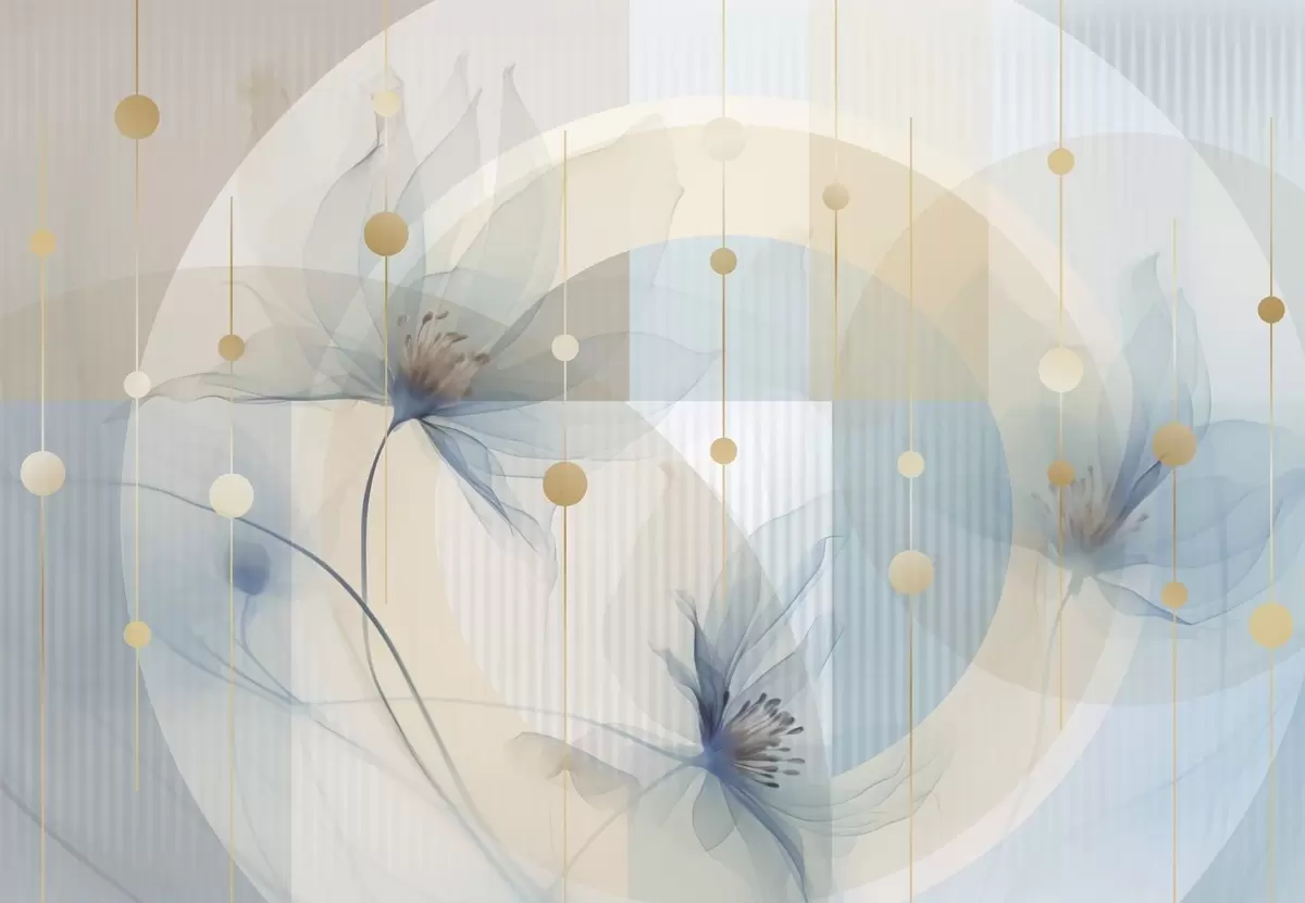 Wall murals Abstract translucent flowers, circles and geometric shapes, pastel blue, beige and white color palette Nr. w09419