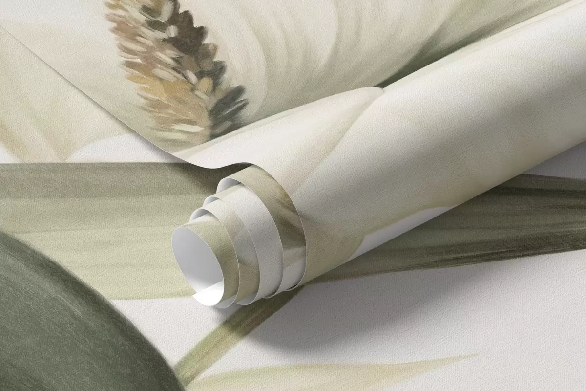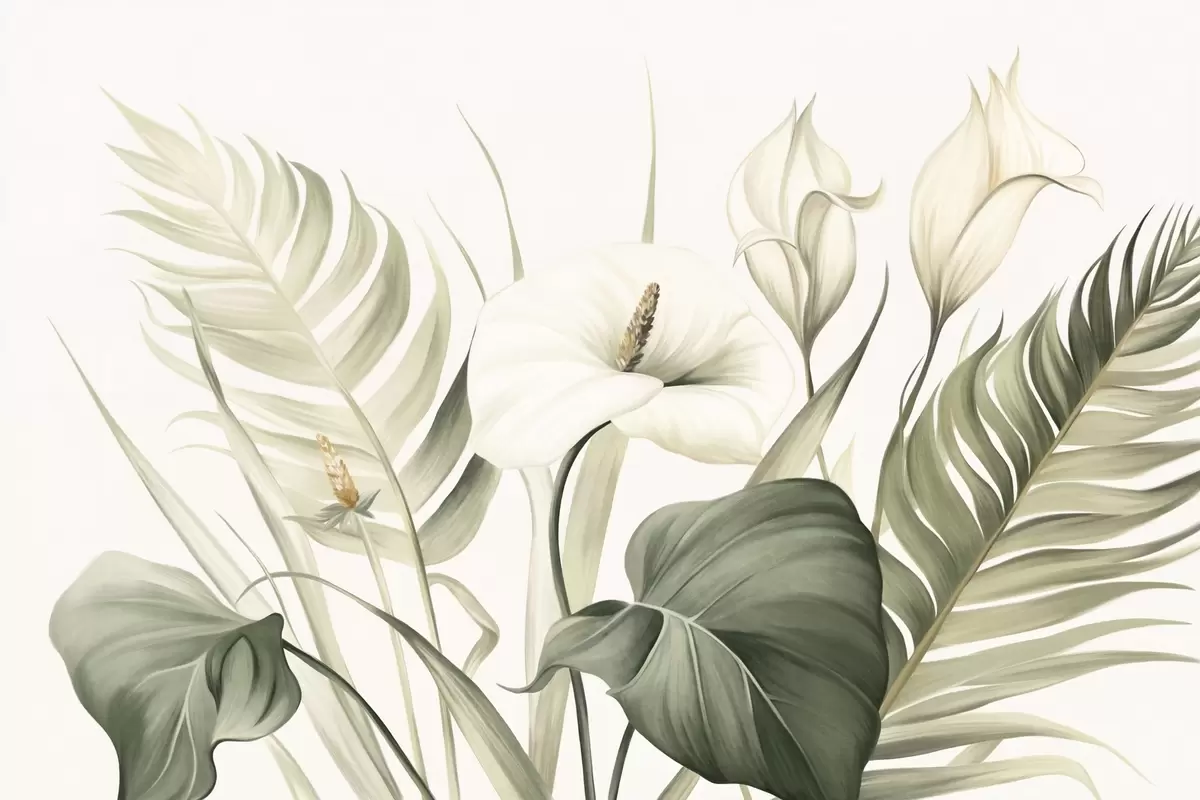Wall murals White calla lilies and green tropical leaves, botanical illustration, light background, vintage style, textured Nr. w09423