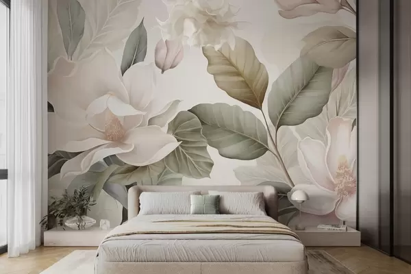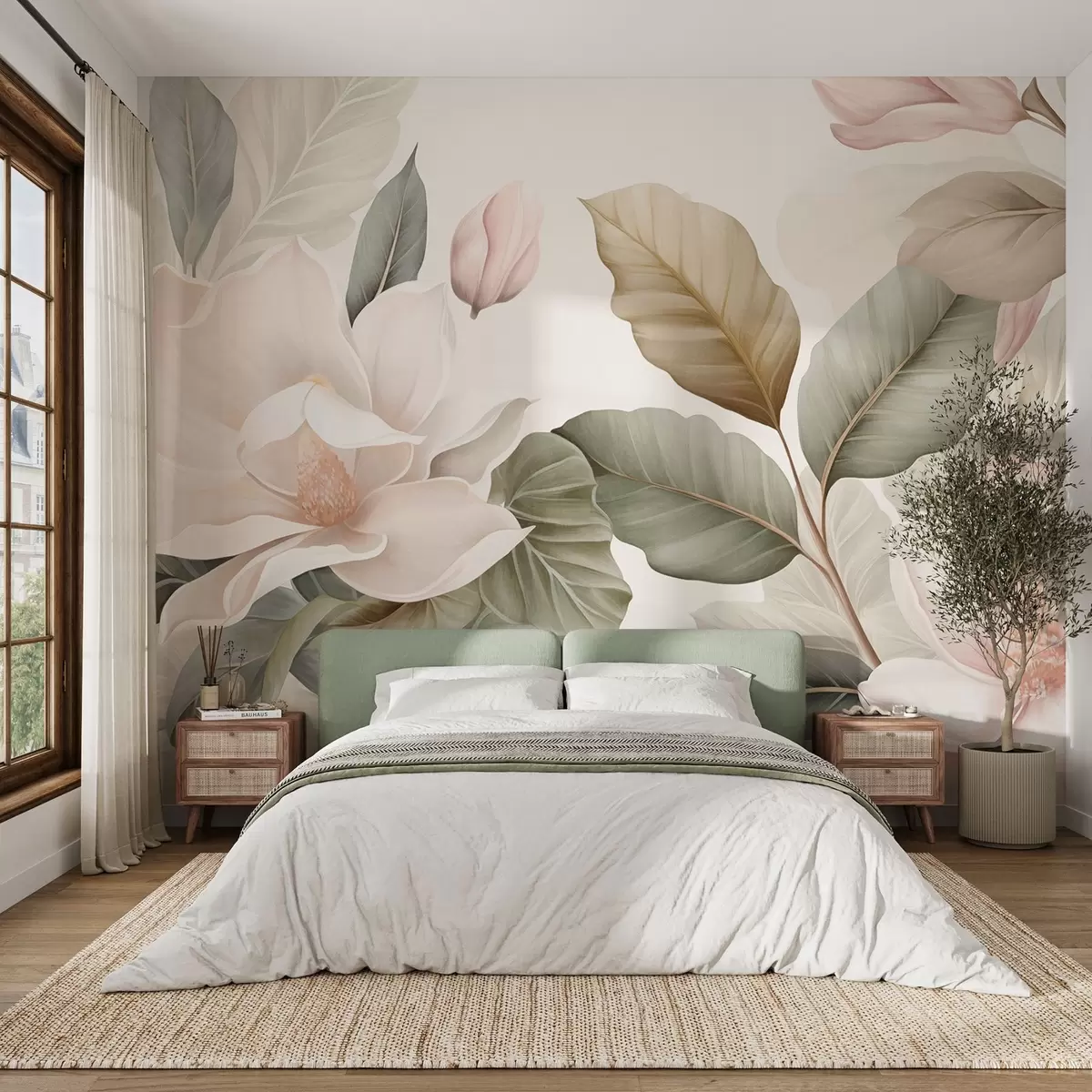 Wall murals Magnolia flowers with leaves in pastel colors, white, pink and green, soft, delicate, watercolor style Nr. w09427