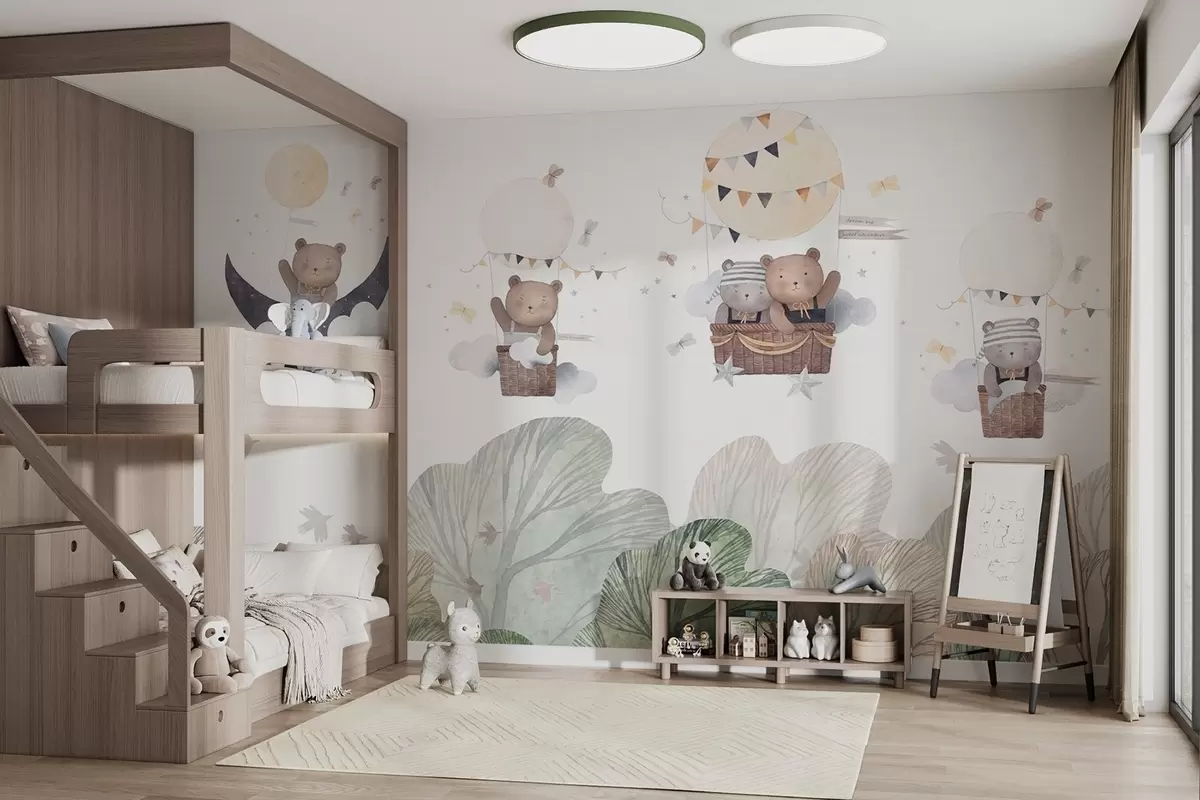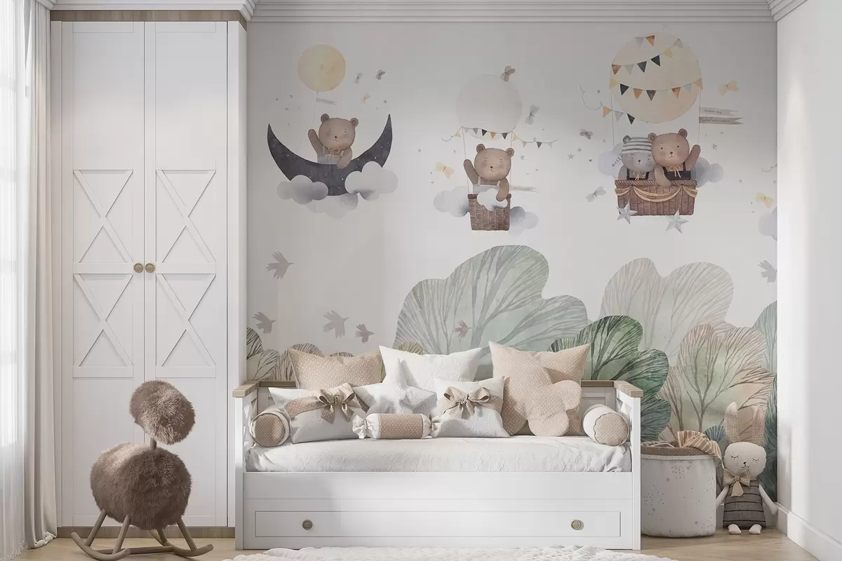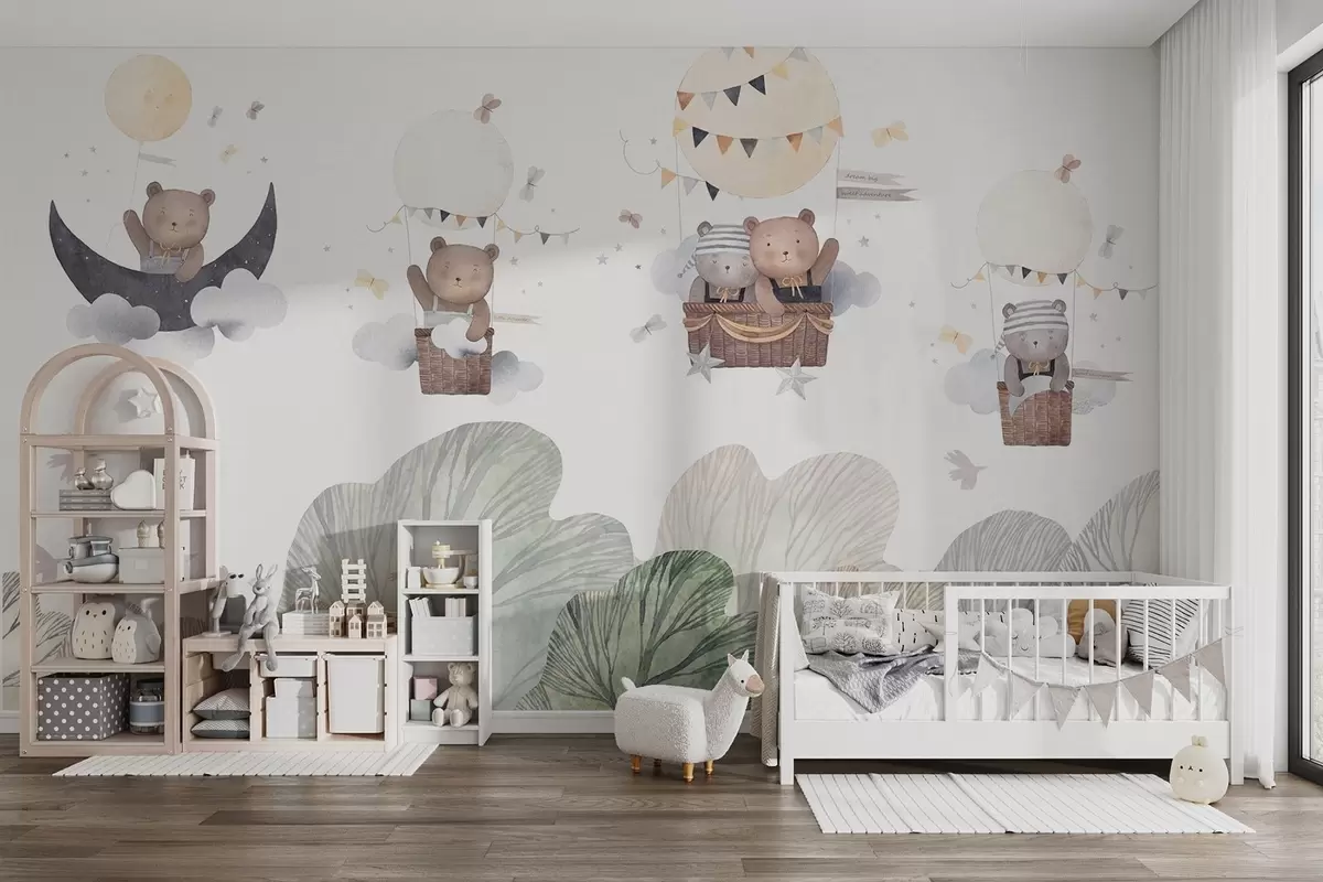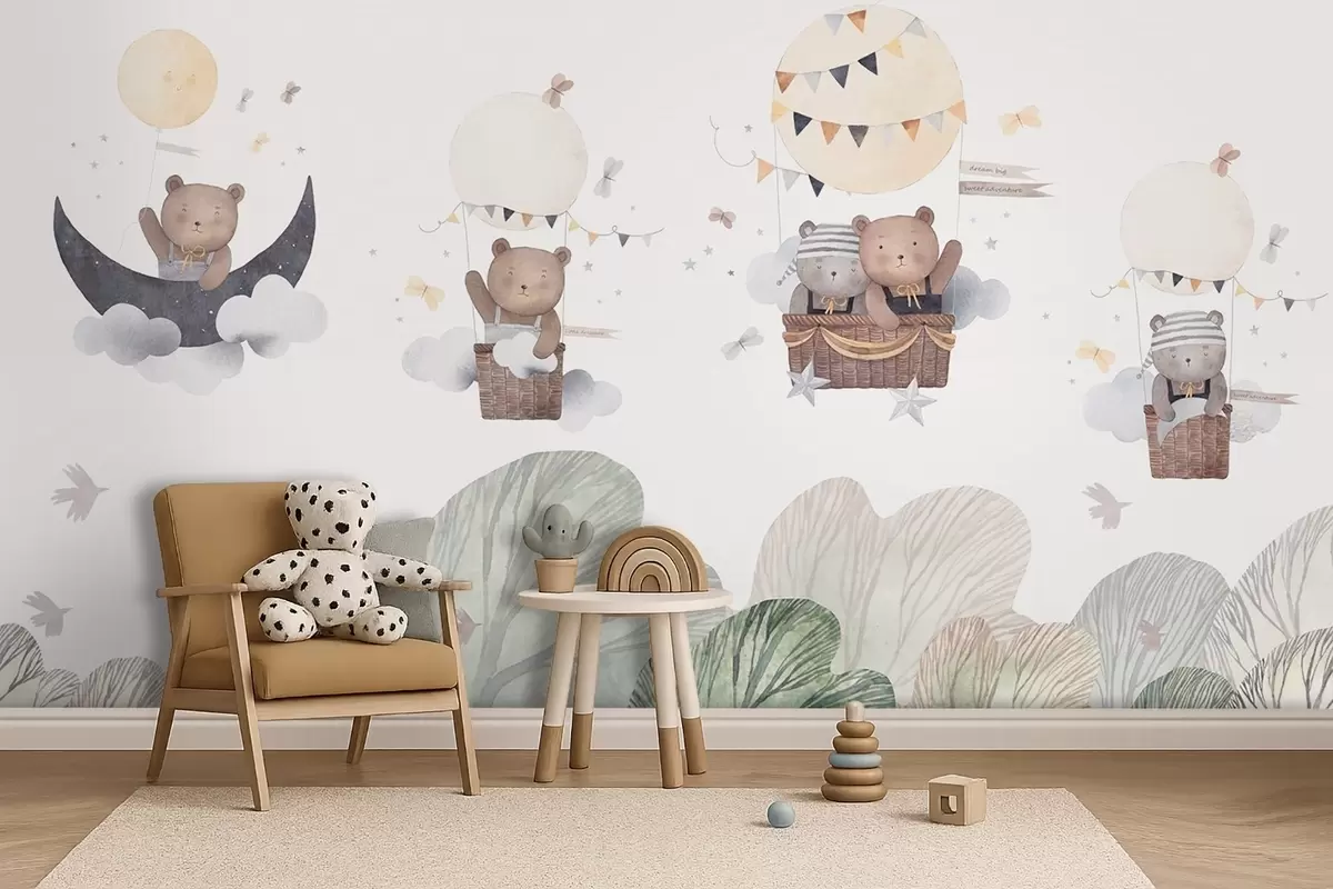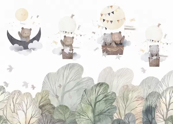 Wall murals Watercolor-style balloons with bears over the forest Nr. w09437