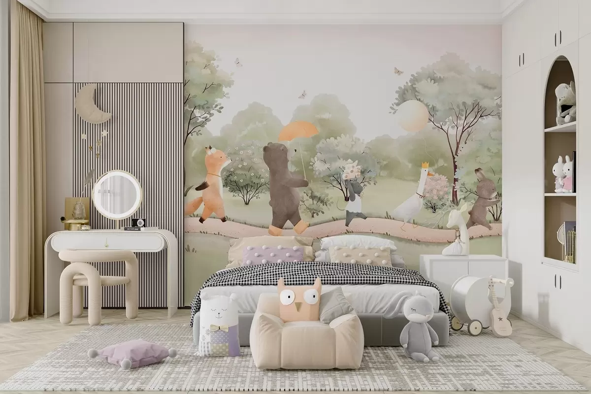 Wall murals Festive journey of little animals through the forest in watercolor style Nr. w09440