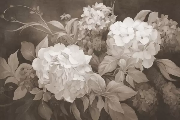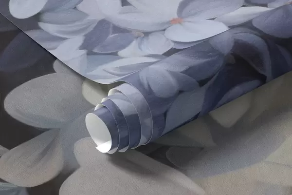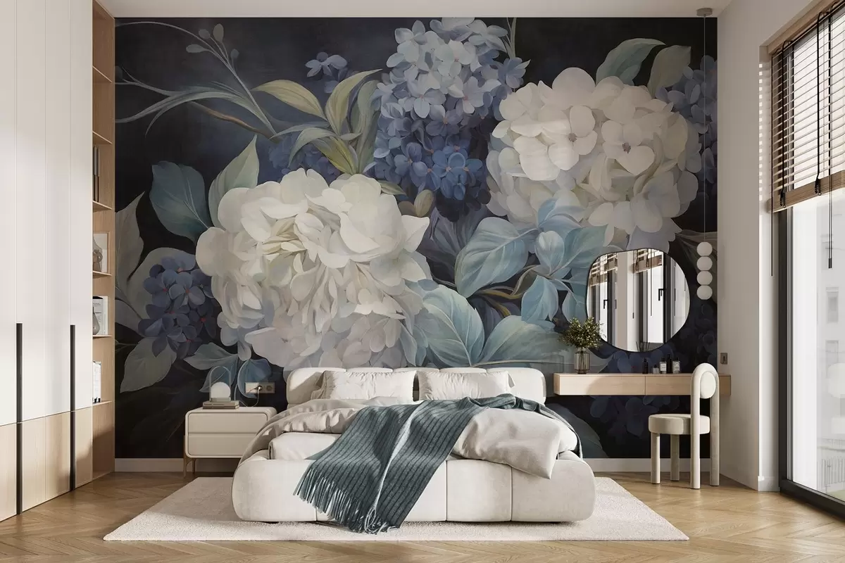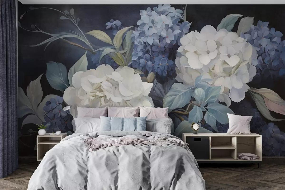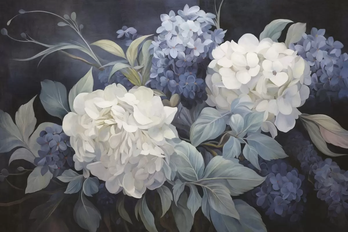 Wall murals Textured dark blue painting imitation of hydrangeas flowers with big leaves, abstract and dark background Nr. w09465v1