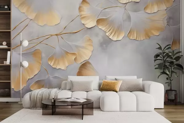 Wall murals Ginkgo biloba leaves with yellow edges on a branch, gray textured background, elegant and minimalist design Nr. w09472