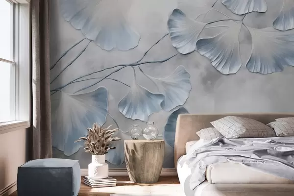 Wall murals Ginkgo biloba leaves with blue edges on a branch, gray textured background, elegant and minimalist design Nr. w09472v1