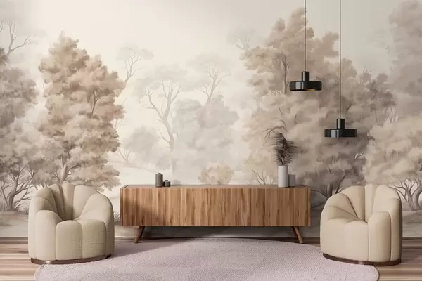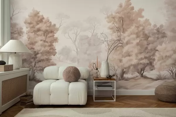 Wall murals Textured landscape painting imitation of a forest with tall trees and grass, muted and soft colors, calming scene Nr. w09474