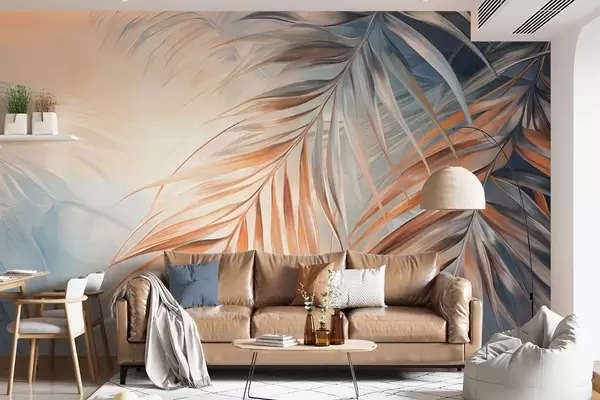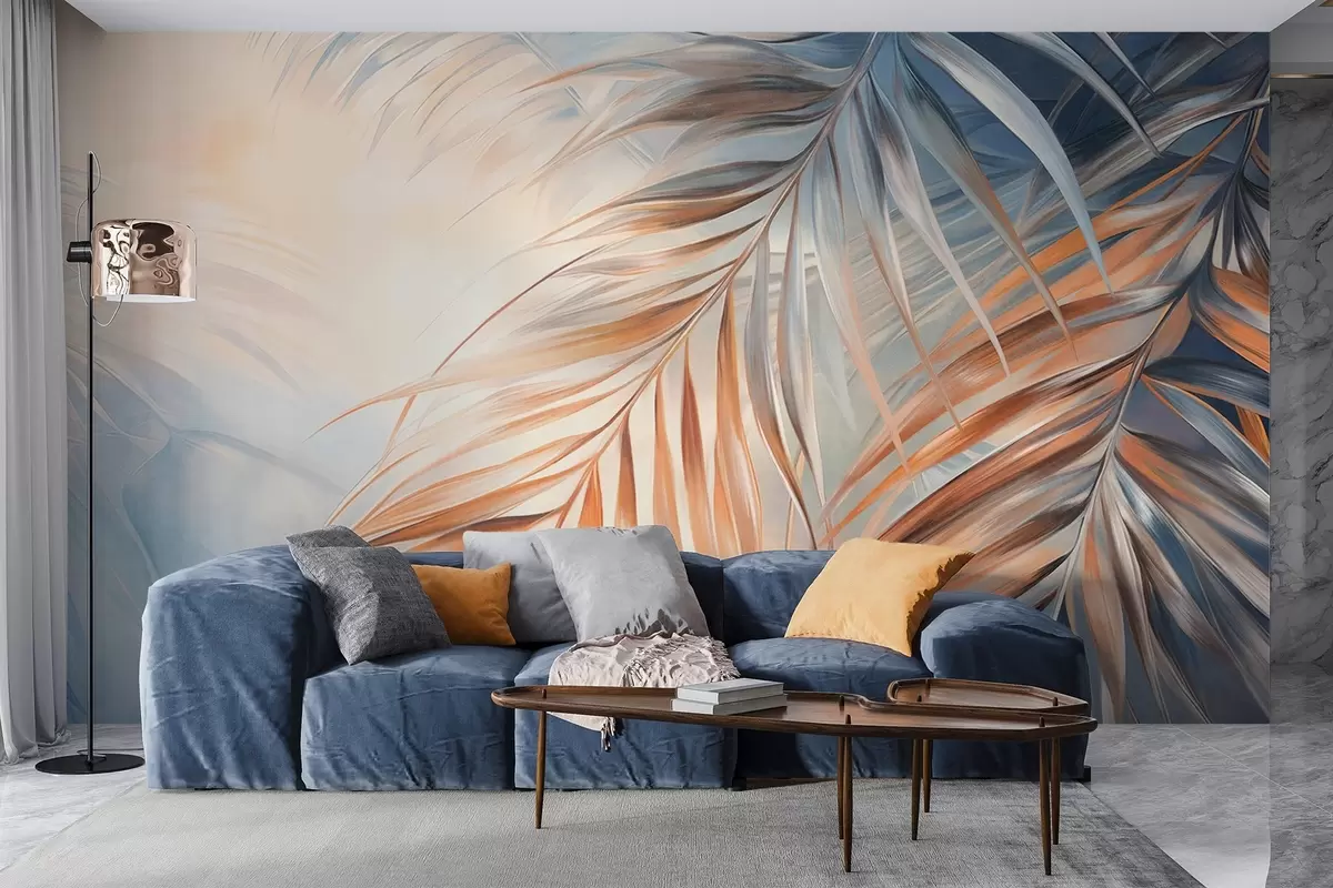 Wall murals Palm leaves with orange and blue tones, light textured background with soft colors, elegant tropical style Nr. w09475